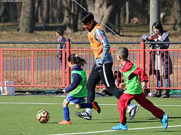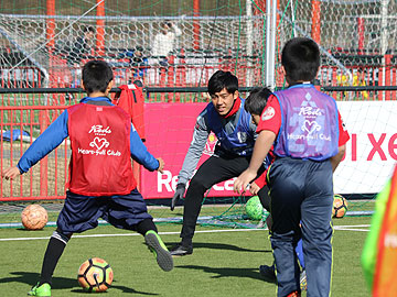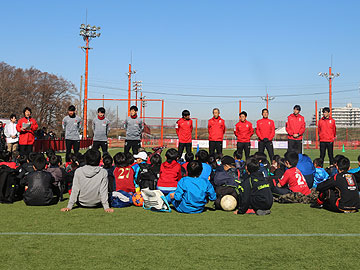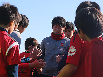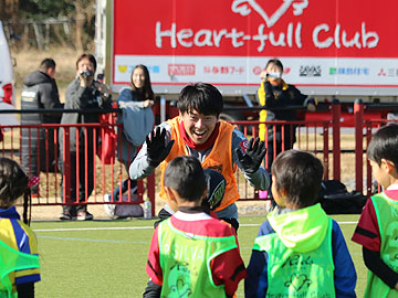 その後は、レッズランドの人工芝グラウンドに移動し、3選手とふれ合う『ふれあいサッカークリニック』が行われた。ハートフルクラブの落合 弘キャプテンをはじめ、宮沢克行、室井市衛、小礒義明、永井良明、西川優大のコーチ陣が進行を担い、3選手と児童たちは、鬼ごっこやじゃんけんゲームなどで身体を動かしてから、ミニゲームを行って交流を図った。ゴールを決めた児童が、笑顔で選手のもとに掛けよってハイタッチで喜びを共有するなど、サッカークリニックは和やかな雰囲気の中で進んでいった。
