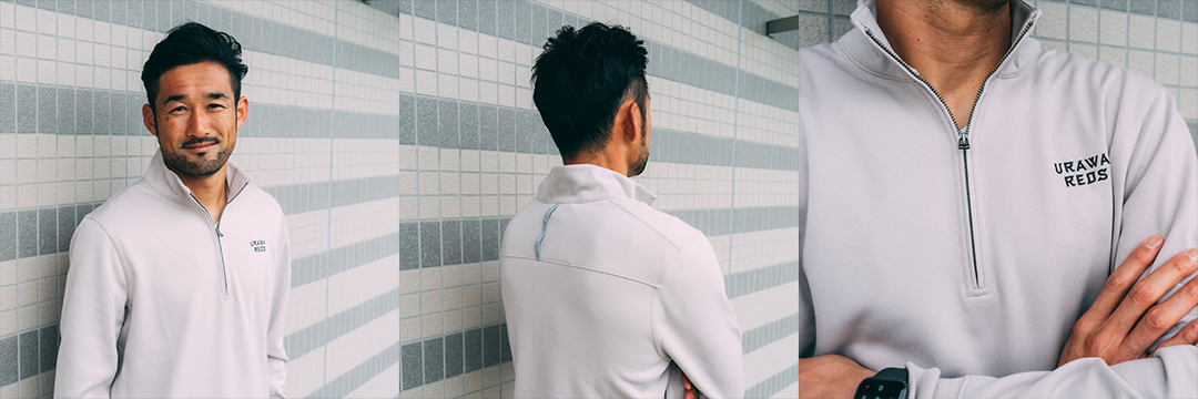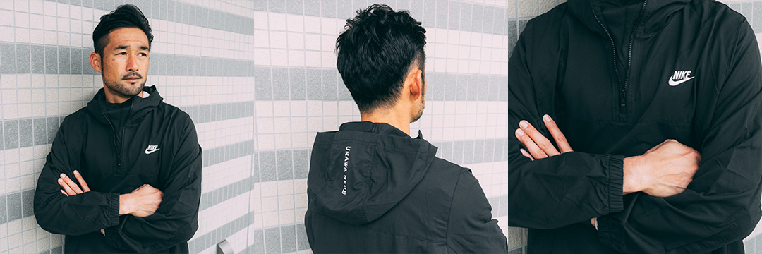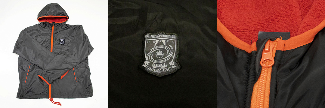 一日を乗り切るためのアイテム。伸縮性に優れたウーブン素材が、一日中暖かくさらりとした状態をキープ。フード面に、縦型でクラブロゴをプリント。