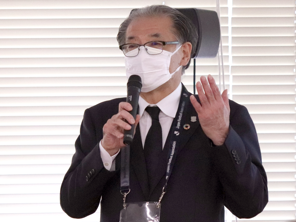 続いて、落合キャプテンからの話があり、まずコロナ禍においてパートナーや地元自治体の多数の方にご参加いただいたことへの感謝を述べ、活動事例を交えながら、(1)仲間を信頼しおもいやるこころ、(2)お互いに楽しむこころ、(3)何事も一生懸命やるこころ、それら3つの『こころ』を育むことの大切さと大変さ、マニュアルではなくコーチングスタッフの人間性が大事であること、まずは自分たちが必死になることが重要であることなど、ハートフル活動の考え方が説明された。