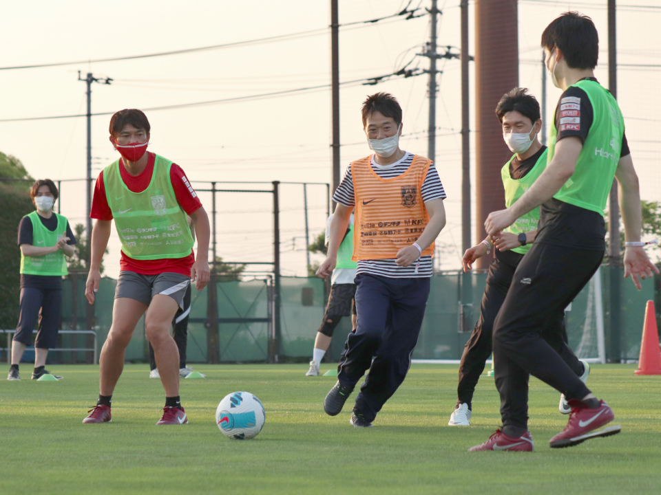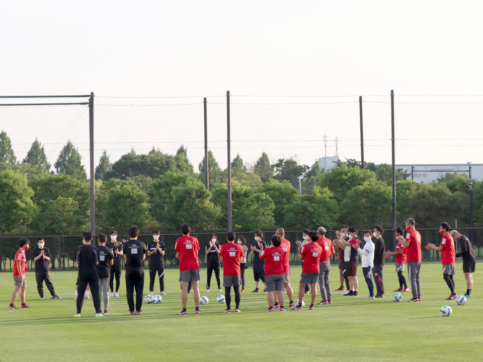 その後、埼玉スタジアム第2グラウンドでサッカースクール体験会が行われた。メインで進行した島田コーチは、実際にハートフルスクールなどで実施しているメニューを行っただけではなく、参加者にも子供たちのように接し、参加者のみなさんも童心に帰ったように緑の芝生の上で元気いっぱいにプレー。活気あふれる雰囲気となった。