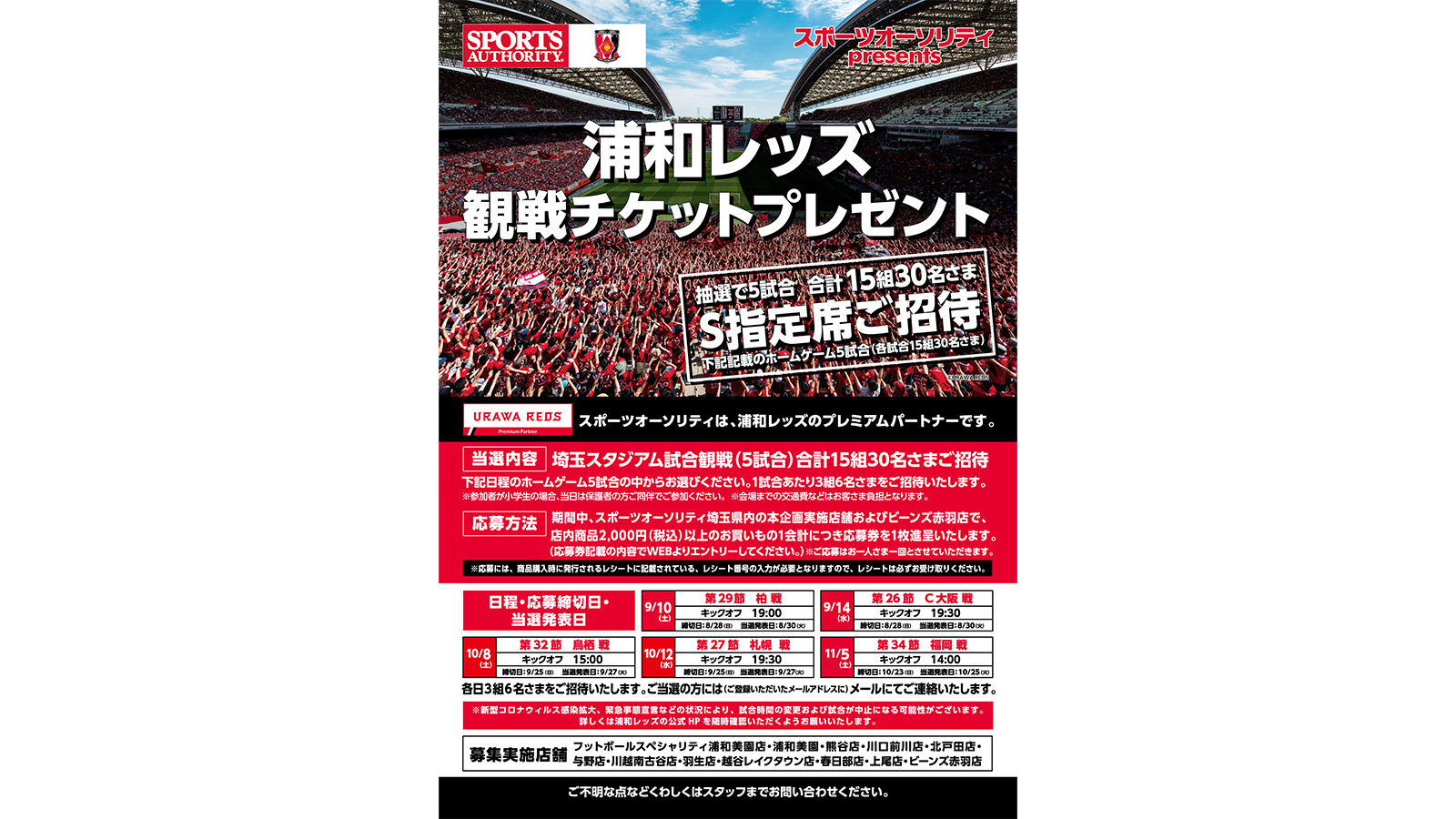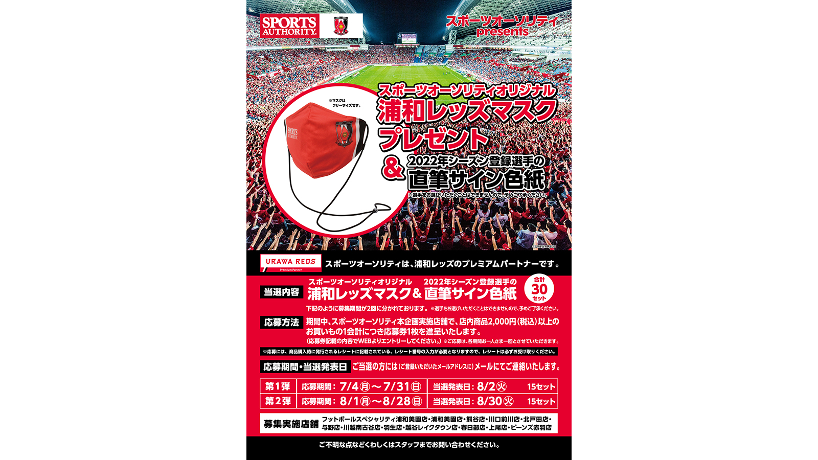 浦和レッズプレミアムパートナーのスポーツオーソリティでは、「浦和レッズ観戦チケットプレゼント」、「スポーツオーソリティオリジナル 浦和レッズマスク&2022年シーズン登録選手 直筆サイン入り色紙プレゼント」のキャンペーンを下記店舗にて開催中です。