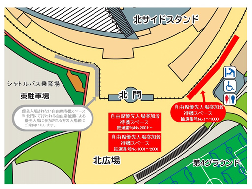 ※より安全な優先入場を実施するため、北サイドスタンド自由席での観戦を希望される方(抽選番号1~100番)に対して、管理番号札を配布させていただきます。管理番号札は、ペデストリアンデッキ上の待機スペース入口にて回収いたします。