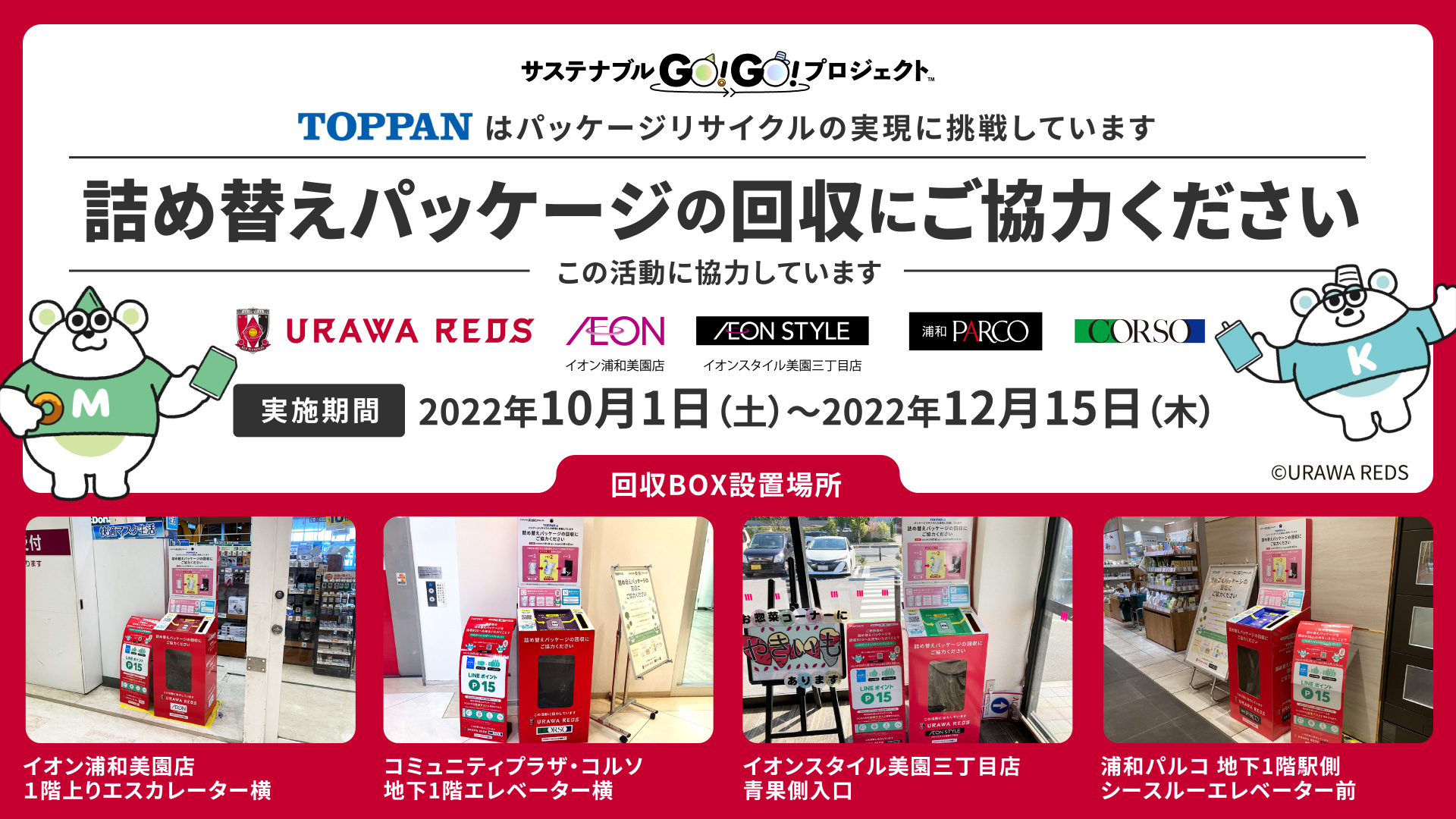 浦和レッズのトップパートナーである凸版印刷株式会社は、12月15日(木)まで、浦和レッズおよび浦和レッズパートナー企業のご協力のもと、シャンプーや洗剤などの日用品詰め替えパッケージの店頭回収を行う実証実験「サステナブルGO!GO!プロジェクト」を実施しています。(回収したパッケージはリサイクル技術の開発検証に活用されます)