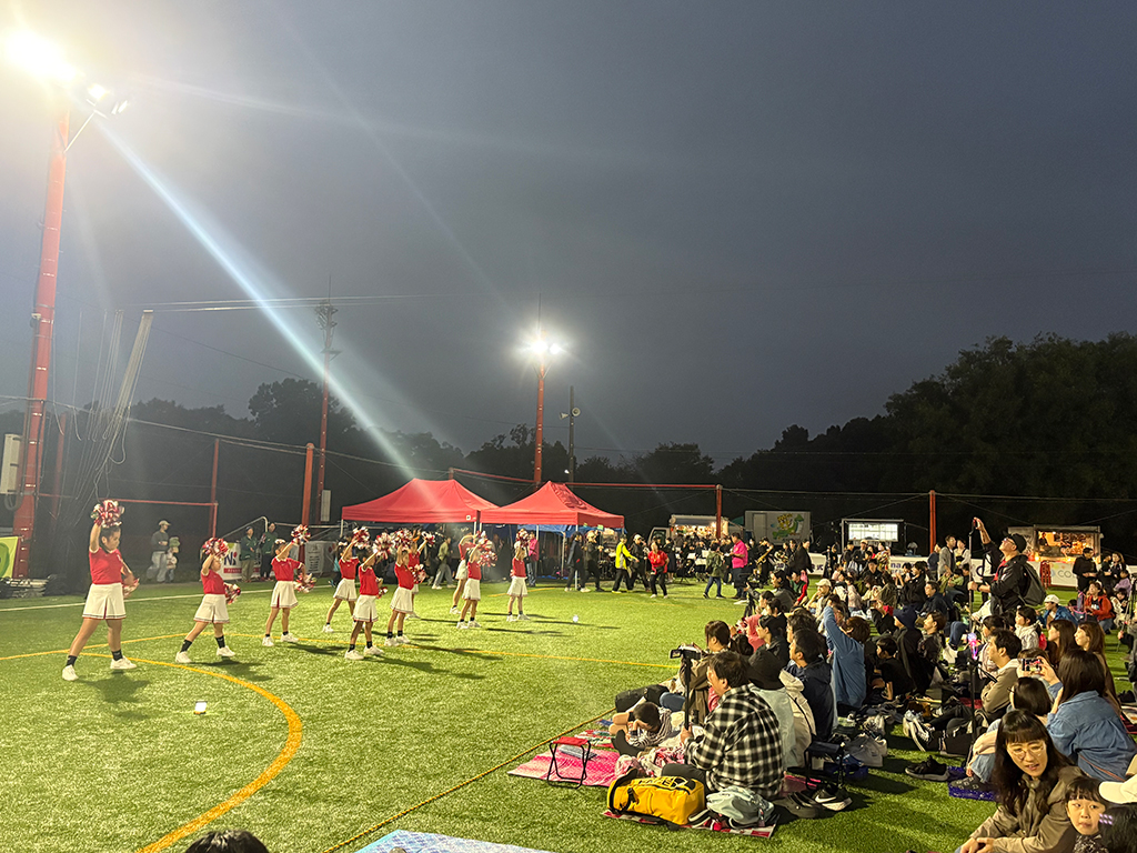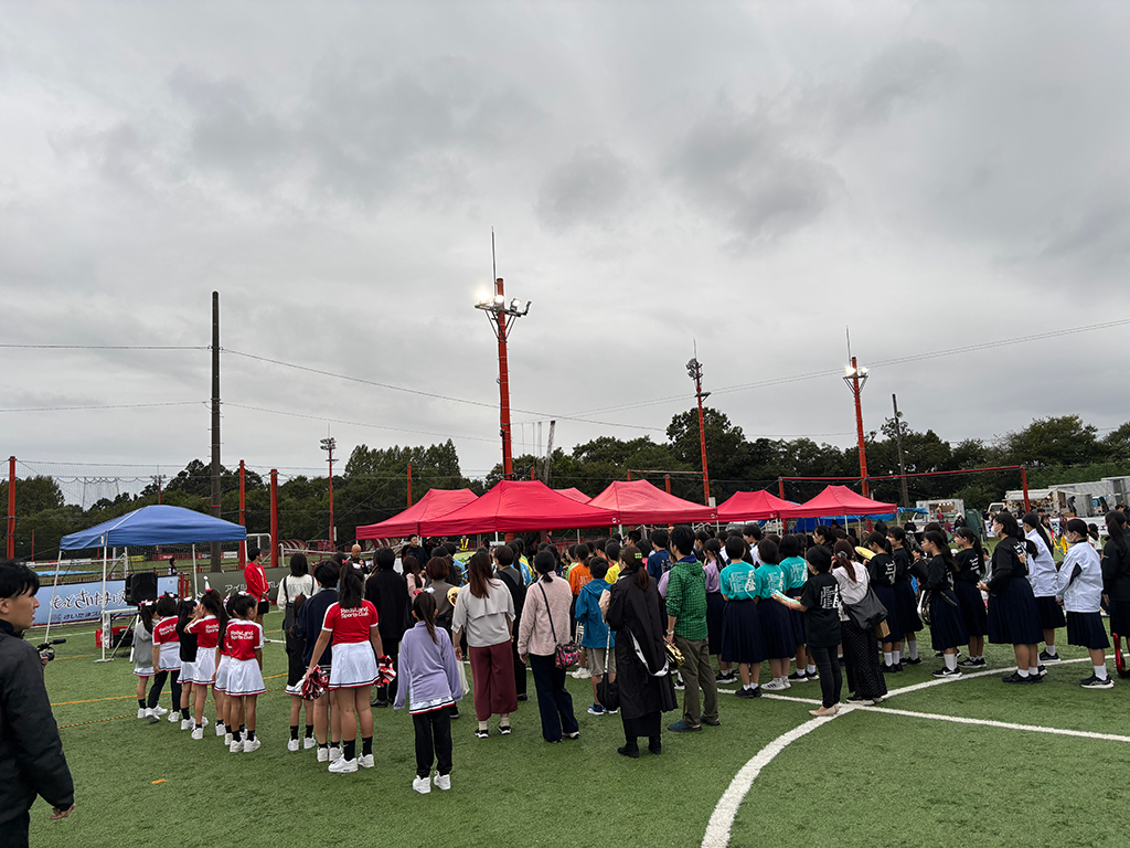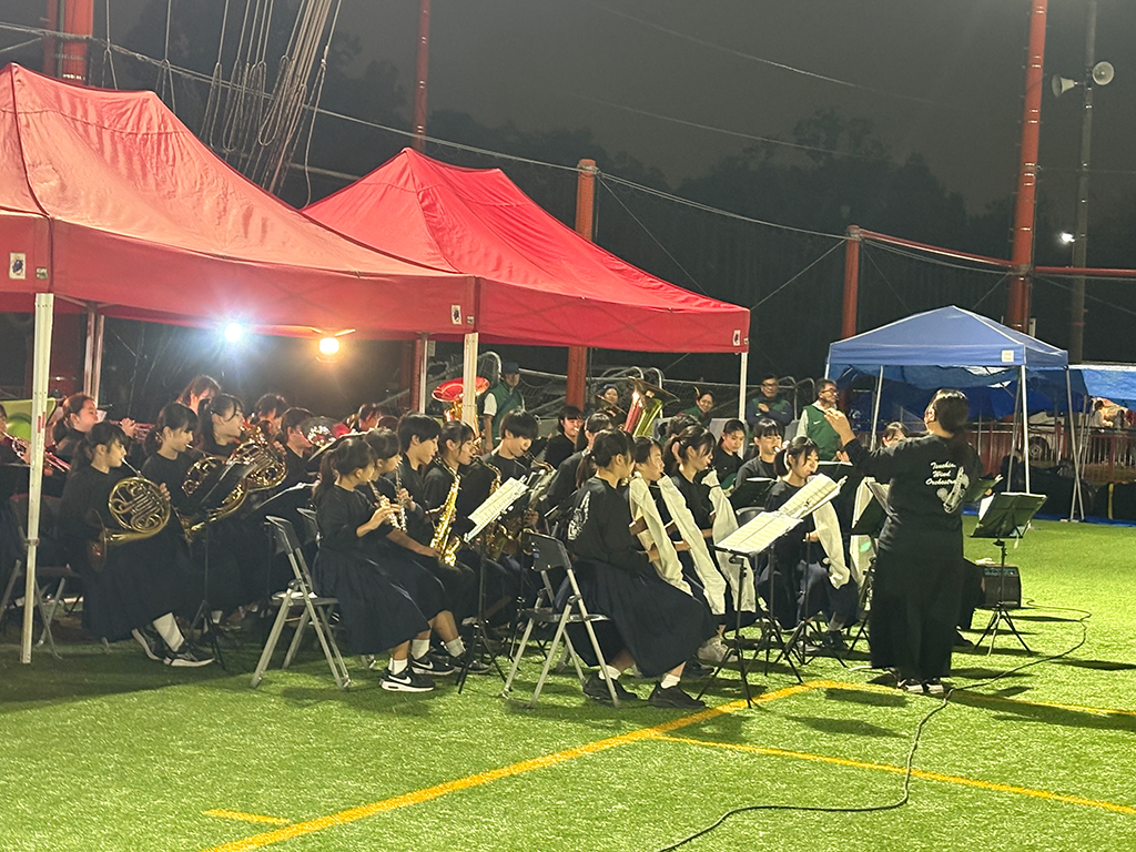 開始前からレジャーシートを敷いて待っていた、ご近所住まいのご家族に話を伺うと、「3年連続で来ています。今年は、お友達家族のお子さんが吹奏楽とチアリーディングで出ているので楽しみにしていました。」と話し、熱心に演奏に耳を傾けていた。