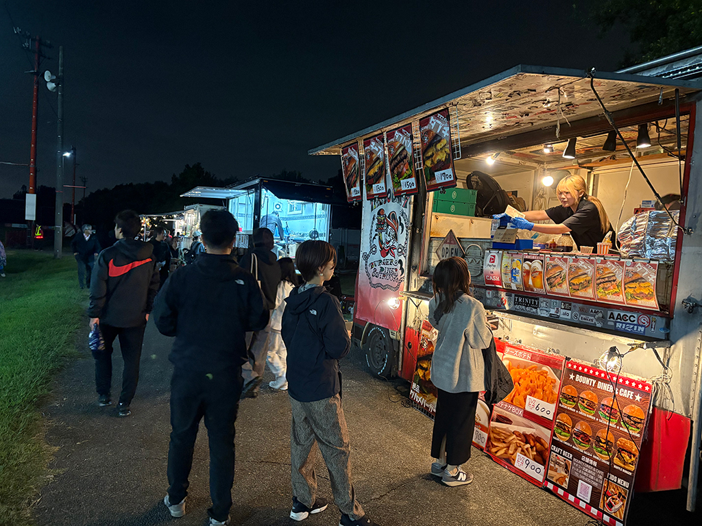 コート脇のキッチンカーには、スタジアムでも販売されているハンバーガーやフランクフルトなどの人気のグルメが並び、たくさんの人で賑わっていた。