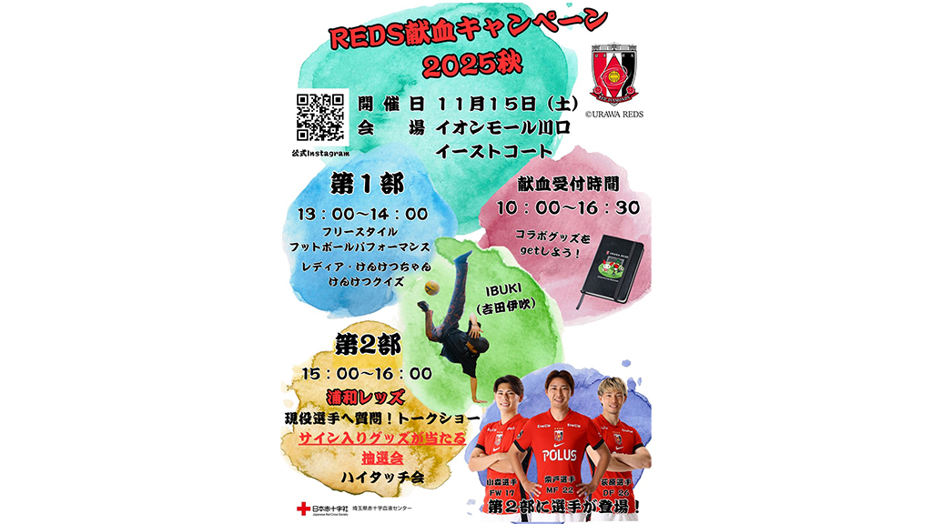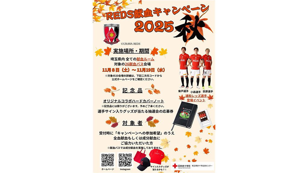 浦和レッズが協力する埼玉県赤十字血液センターの『REDS献血キャンペーン2025秋』が11月8日(土)から11月19日(水)に実施されます。