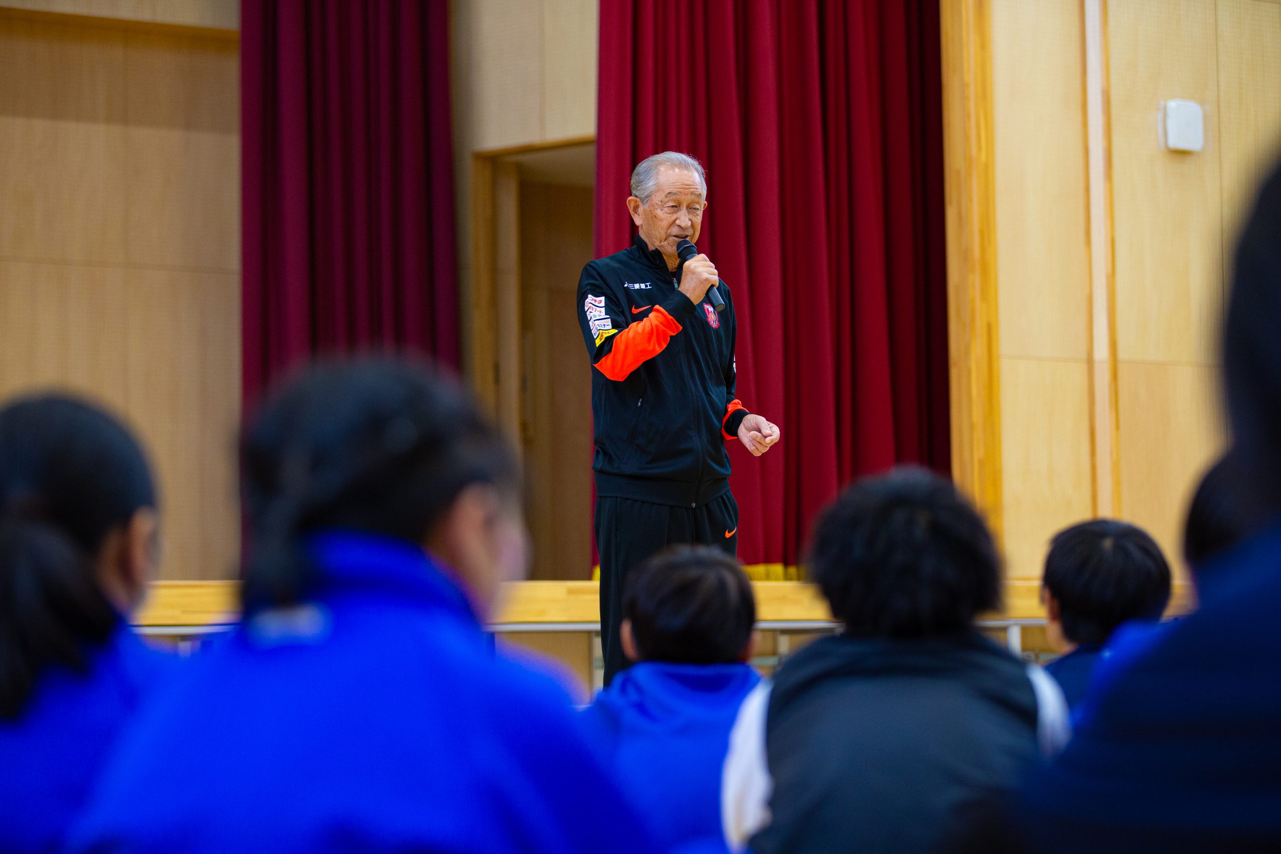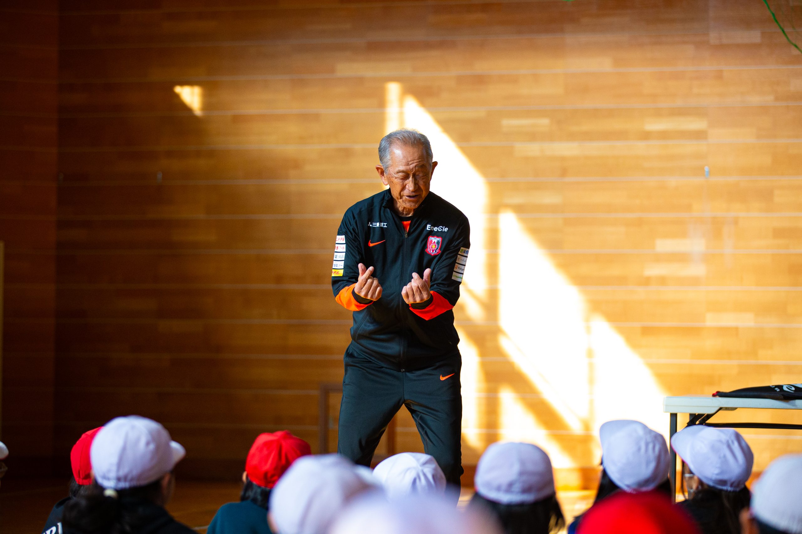 活動はこれまで、そして埼玉での活動同様、実技だけでなく、「こころ」を大切にすることが中心。実技に先立ち、キャプテンの落合 弘が、講話を行った。幼少期の苦労の話、日本サッカーの祖クラマー氏から学んだこと、ブータンのハートフルサッカー活動など、様々な体験を通じた学びを伝える講話のなかで「一生懸命」「おもいやり」「楽しく」のこころを共有。45分の講話に、子どもたちはみな熱心に耳を傾けた。