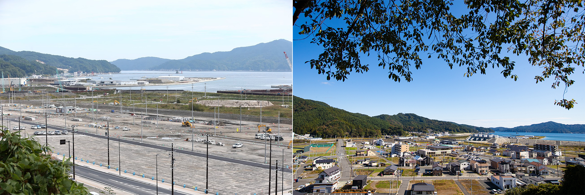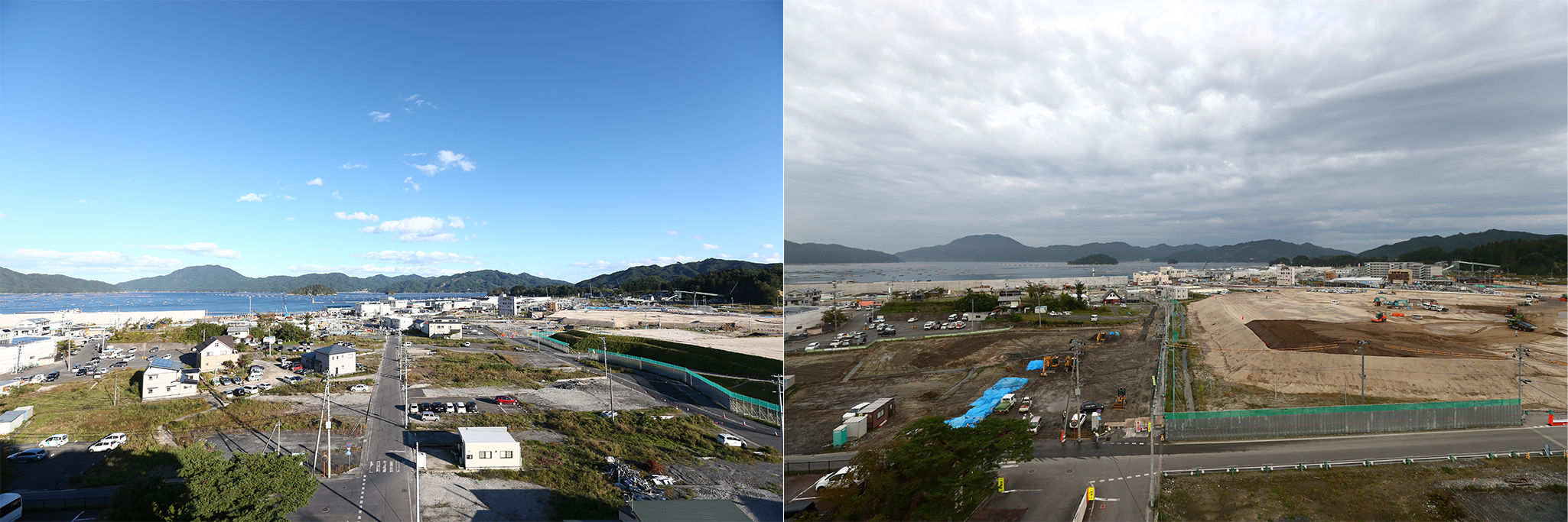 2015年(左)と盛り土をしている2016年(右)の山田町の様子