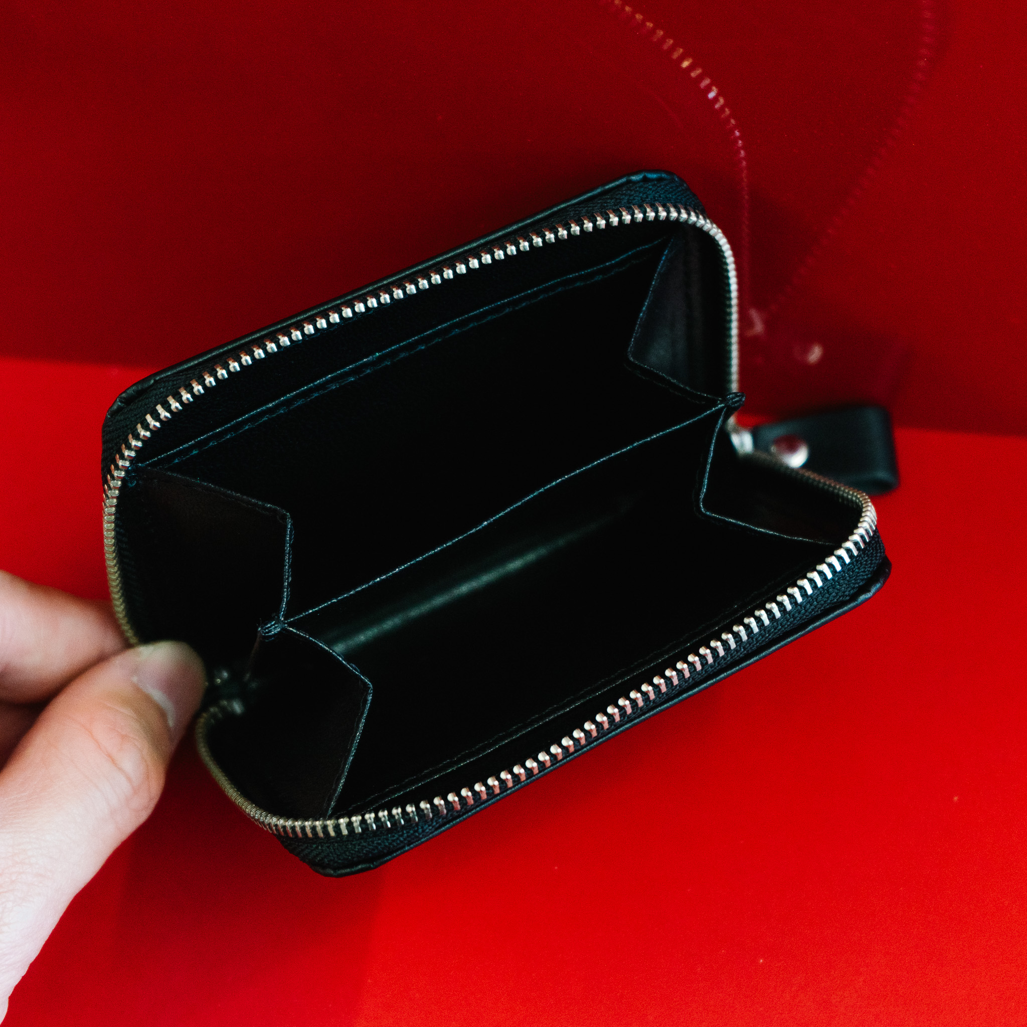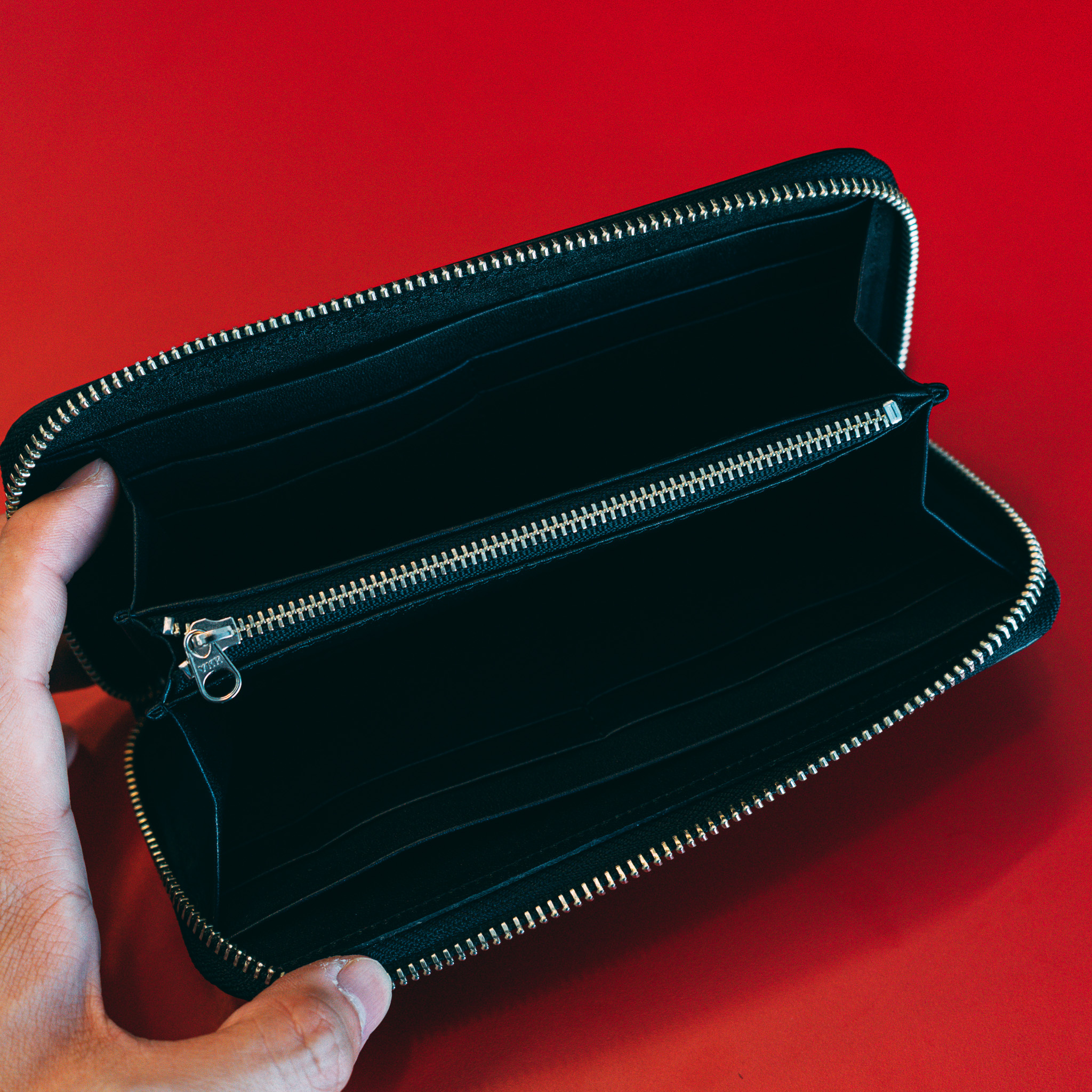 ファスナーで大きく開く収納部には、カードや紙幣、小銭をスマートに整理できるスペースを確保。高い収納力と上品なデザインを両立しました。