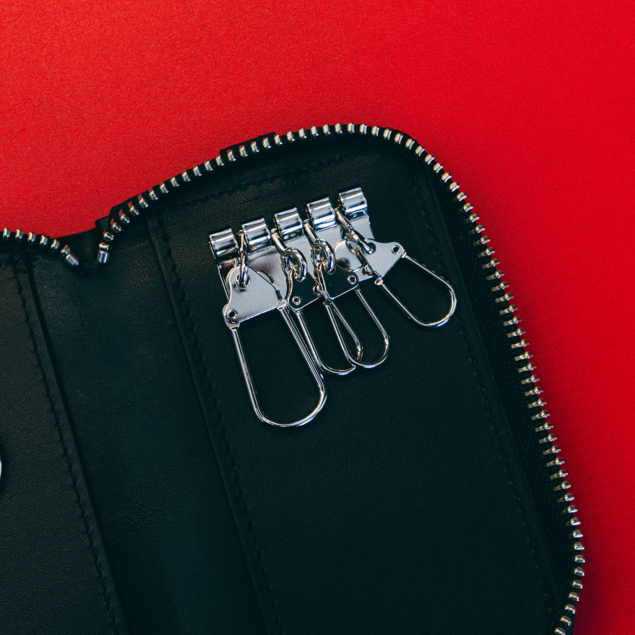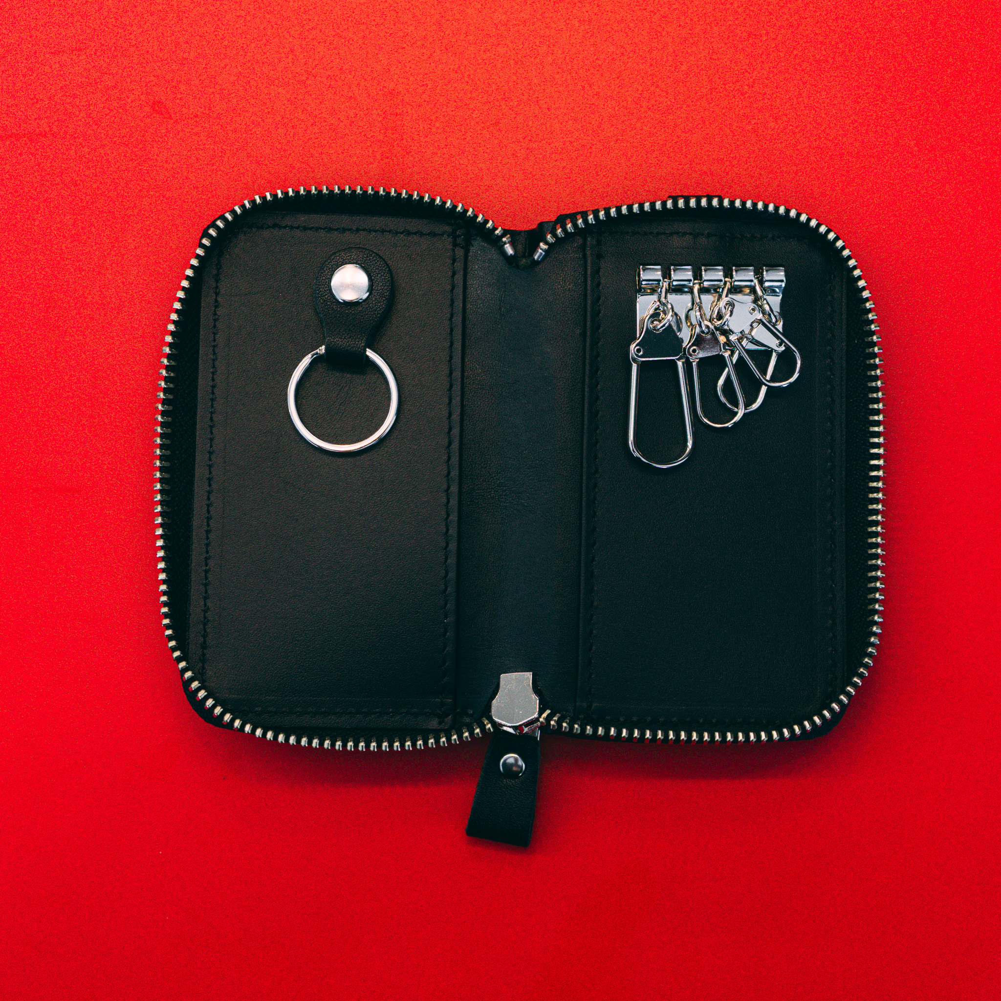 メインスペースには厚みのあるスマートキーを収納でき、4連フックとリングで家の鍵もまとめて一元管理可能です。ファスナー付きで落下を防ぐ高い安心感も魅力。