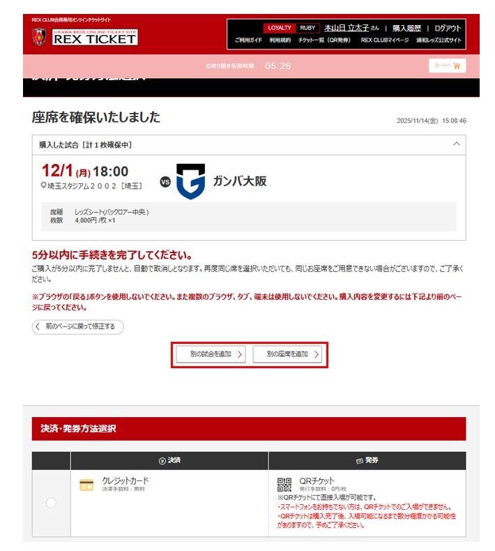 REX TICKETで座席確保後、「決済・発券方法選択」画面にて表示される「別の試合を追加」「別の座席を追加」ボタンから、追加でチケットを選択できます。