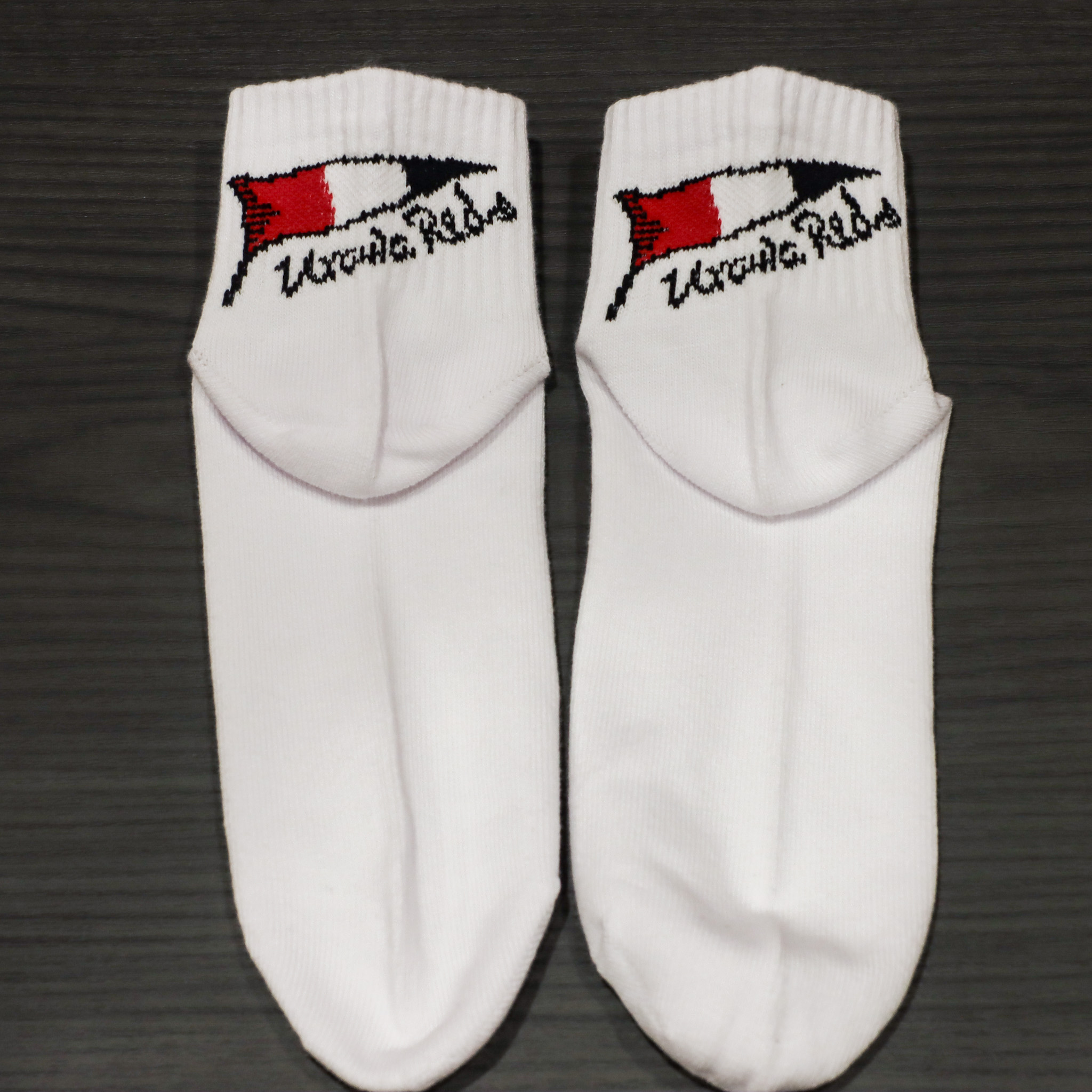 大きめのフラッグが映えるデザインと、総柄デザインの2足をセットにし、クラブカラーの真っ赤なギフトボックスに収めました。