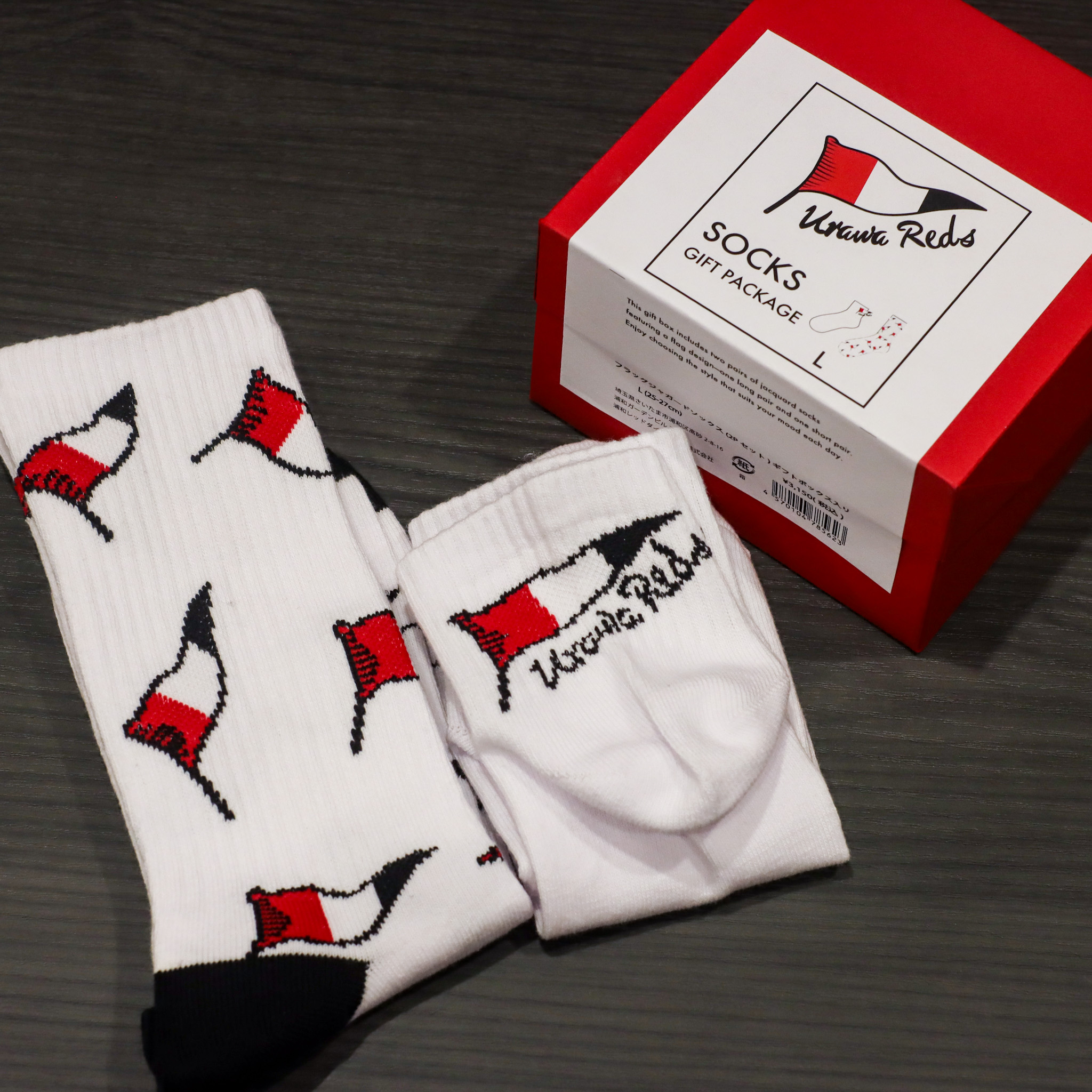 大きめのフラッグが映えるデザインと、総柄デザインの2足をセットにし、クラブカラーの真っ赤なギフトボックスに収めました。