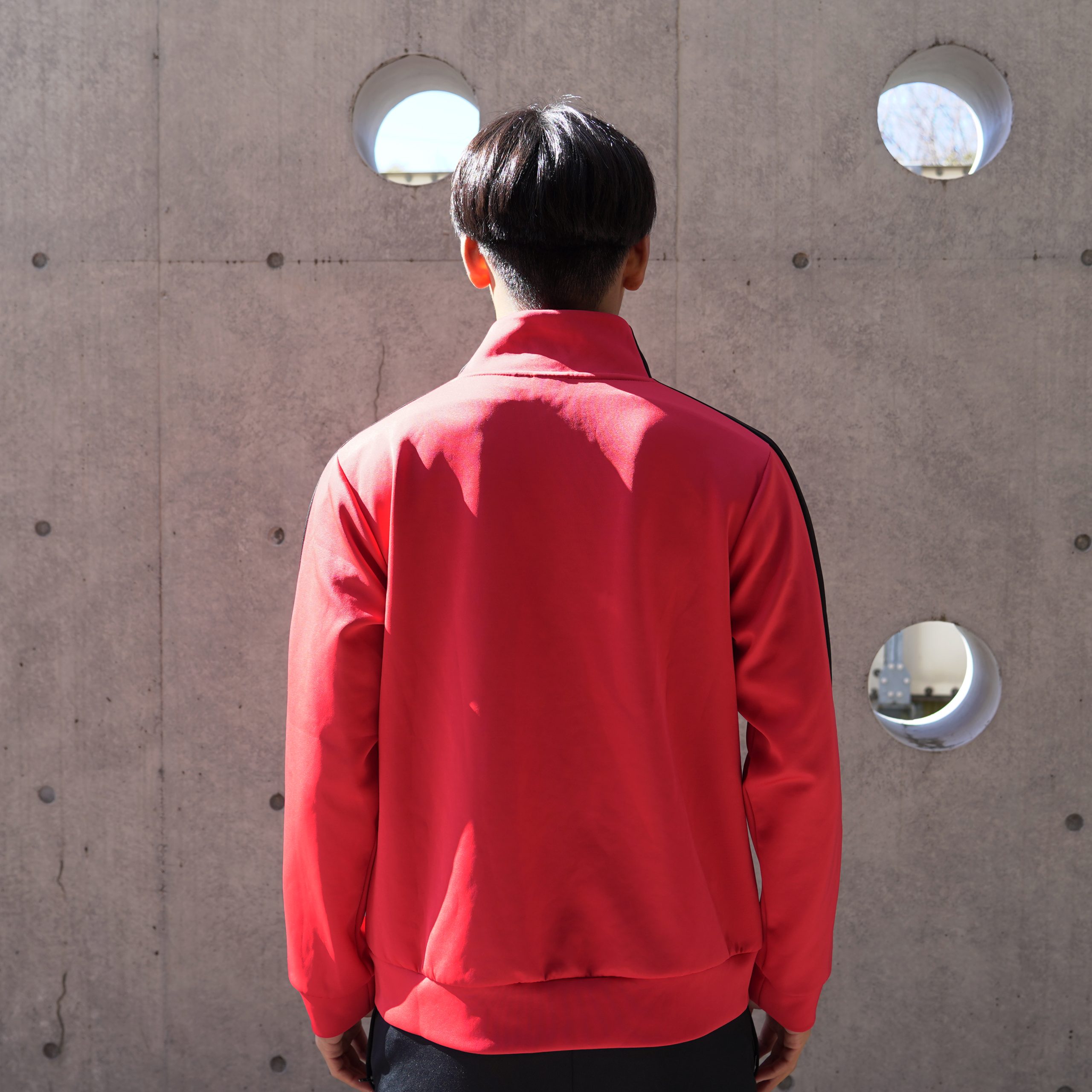 真っ赤なボディに、シンプルなワンラインが映えるジャージ。