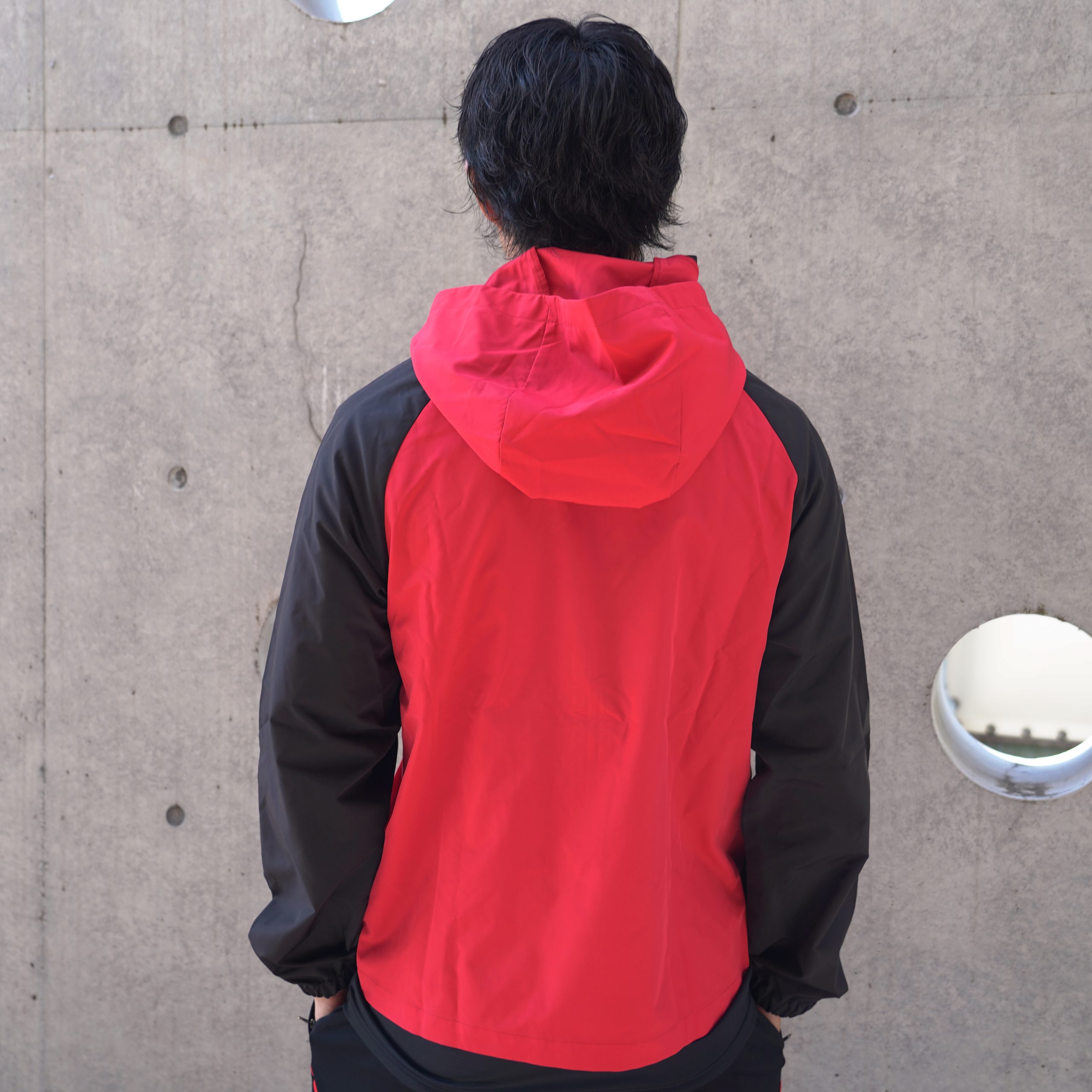 真っ赤なボディにブラックの配色が映える、ミニマルなデザインのウィンドブレーカー。