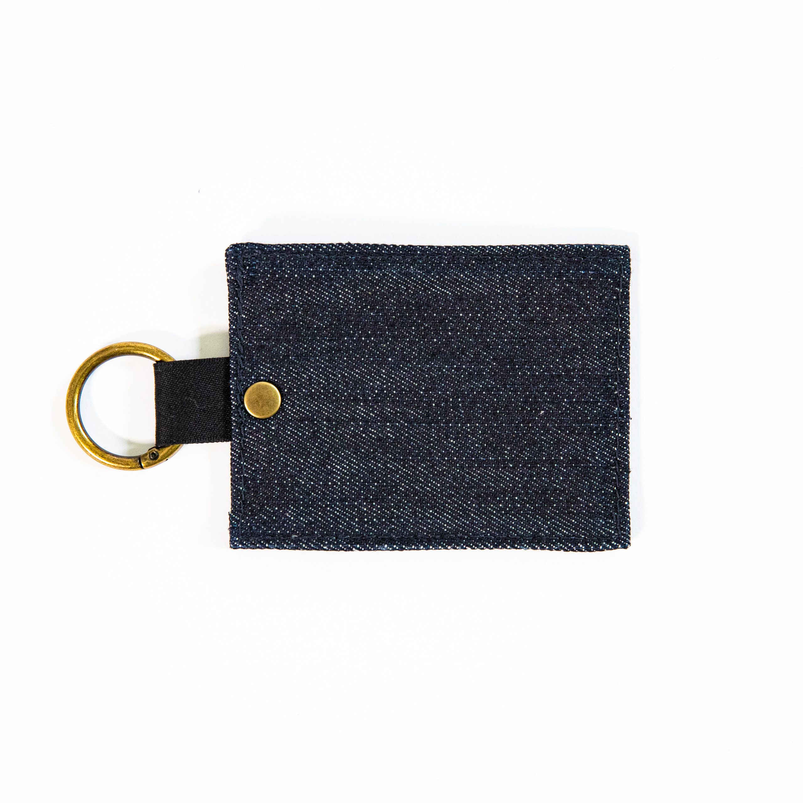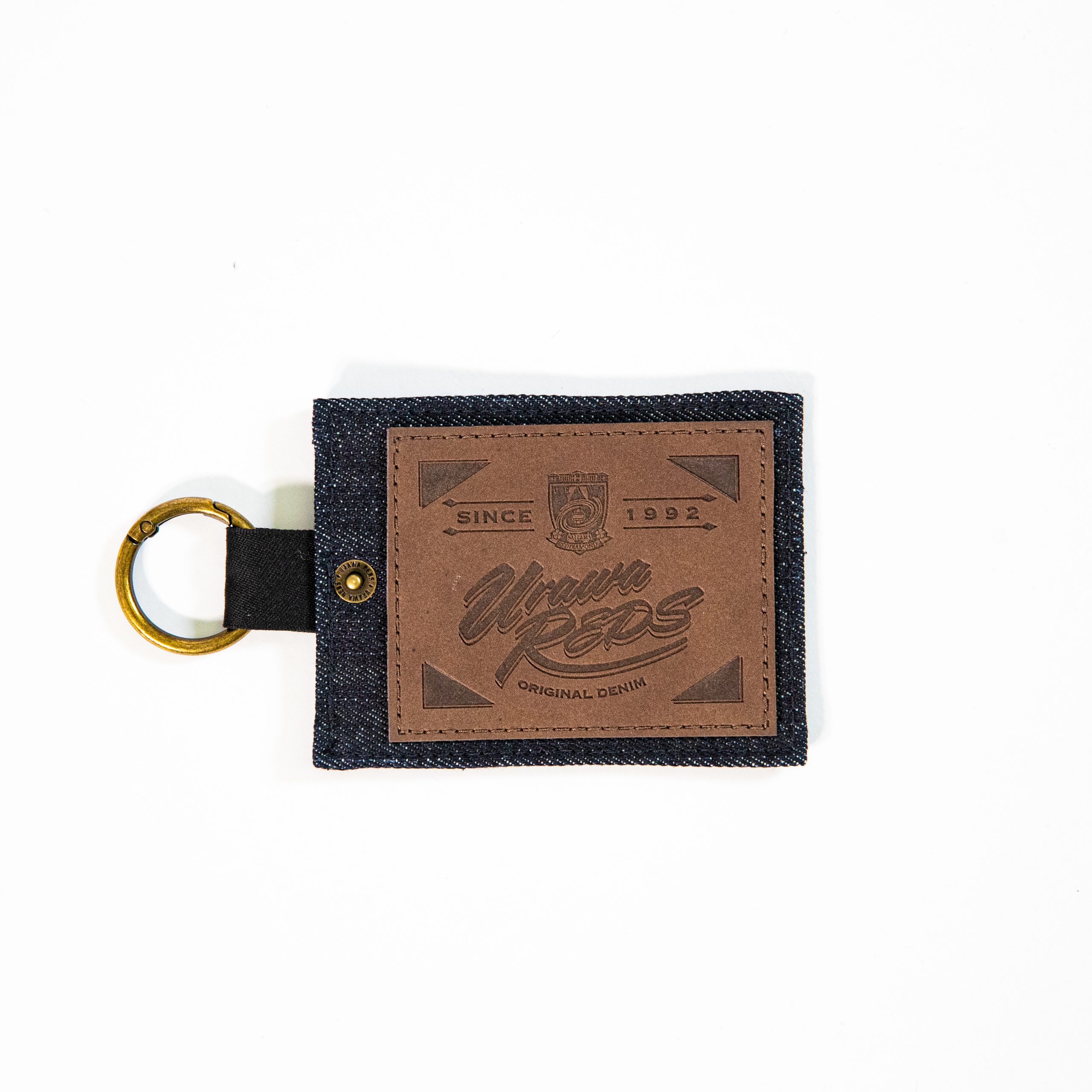 大胆に革パッチを縫い込んだ、シンプルながらもインパクトのあるキーホルダー。
