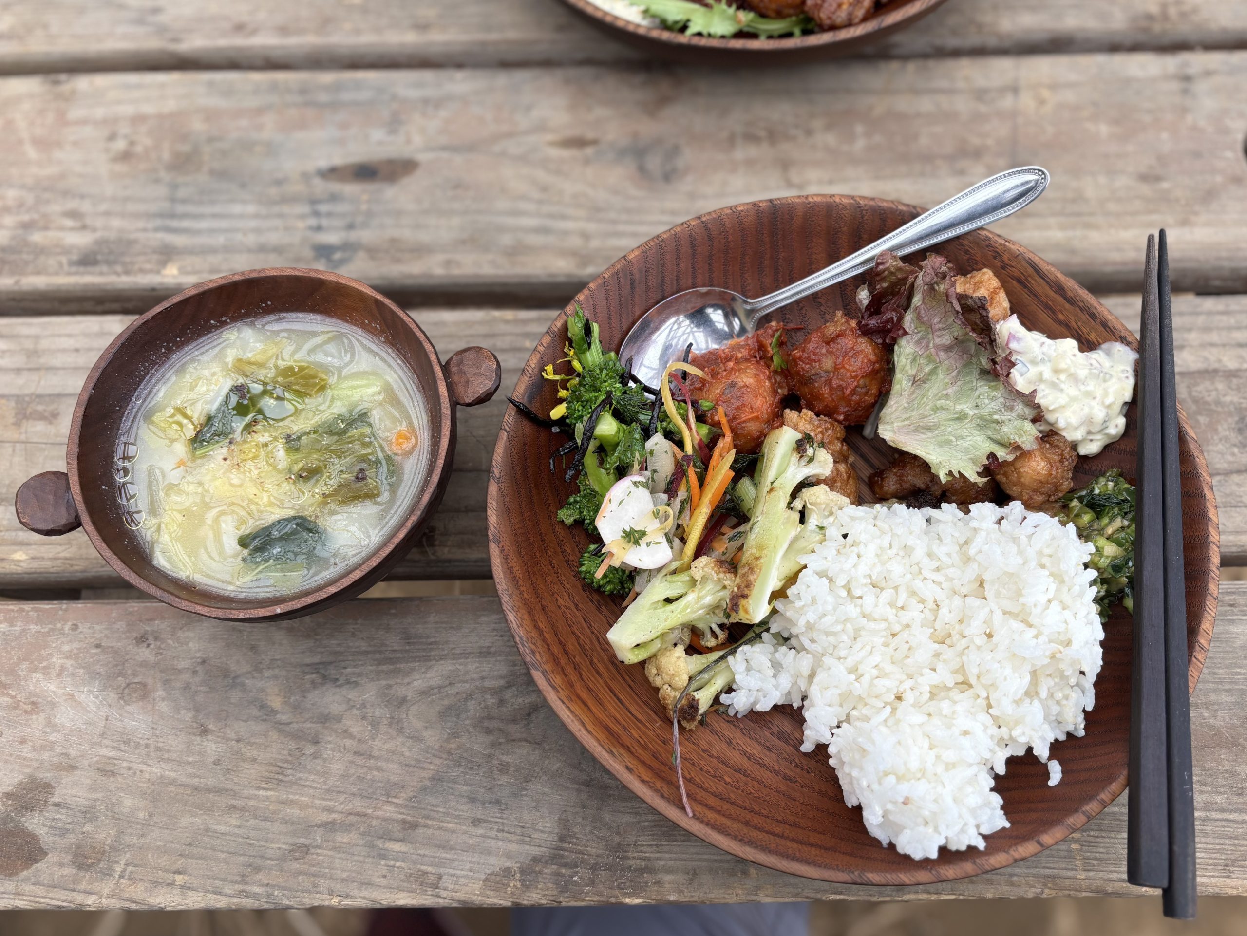 大豆を使用した唐揚げやミートボール風の料理、SHO FARM産のお米や、野菜を使ったグリルや和え物などが提供され、環境負荷を抑えながらも満足感のある食のあり方について理解を深めました。