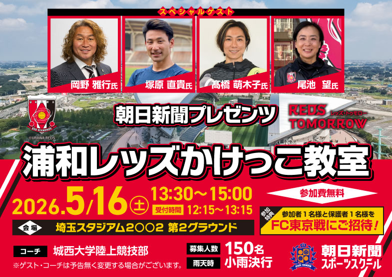 5月16日(土)に行われる『朝日新聞プレゼンツ 浦和レッズかけっこ教室』の開催について、お知らせいたします。