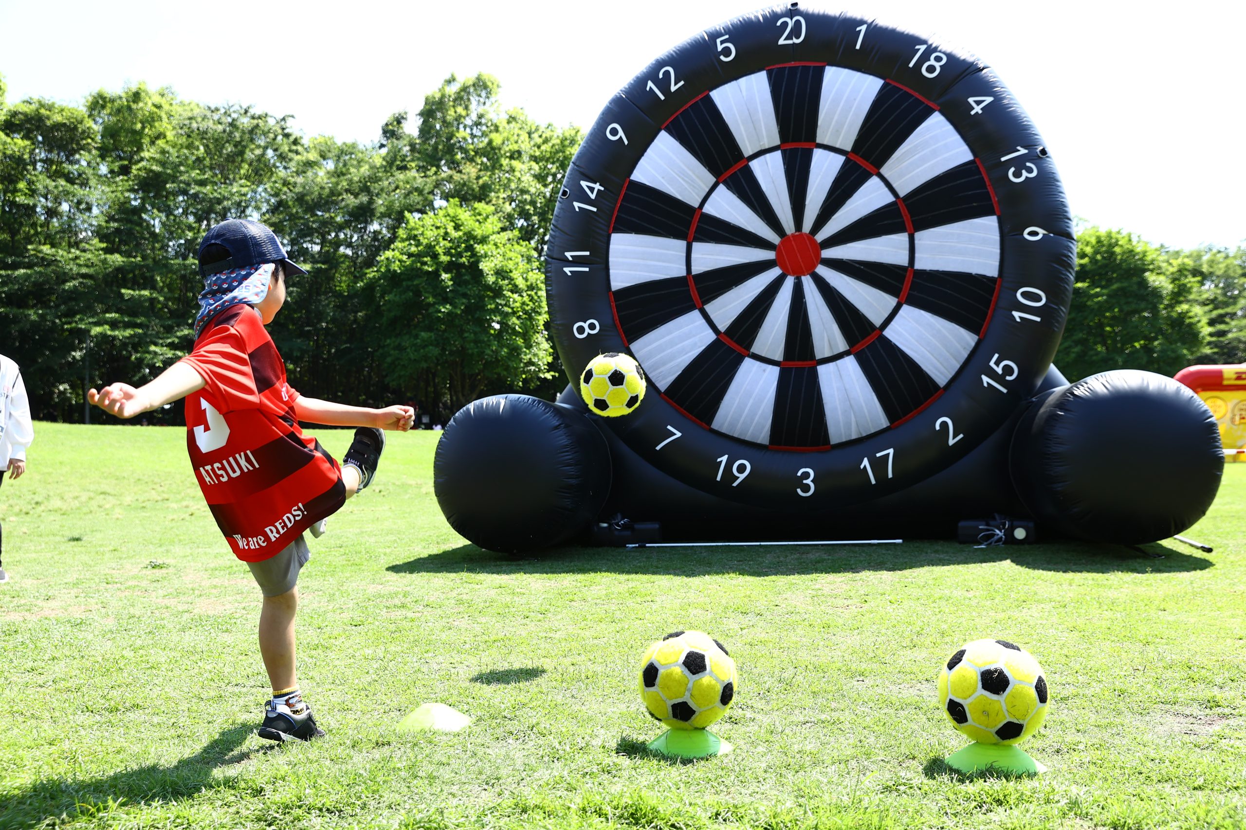 高さ4mの巨大エアーダーツ盤に向かってボールを蹴ります。ボールが的に当たると貼り付き、ダーツのように得点を競います。