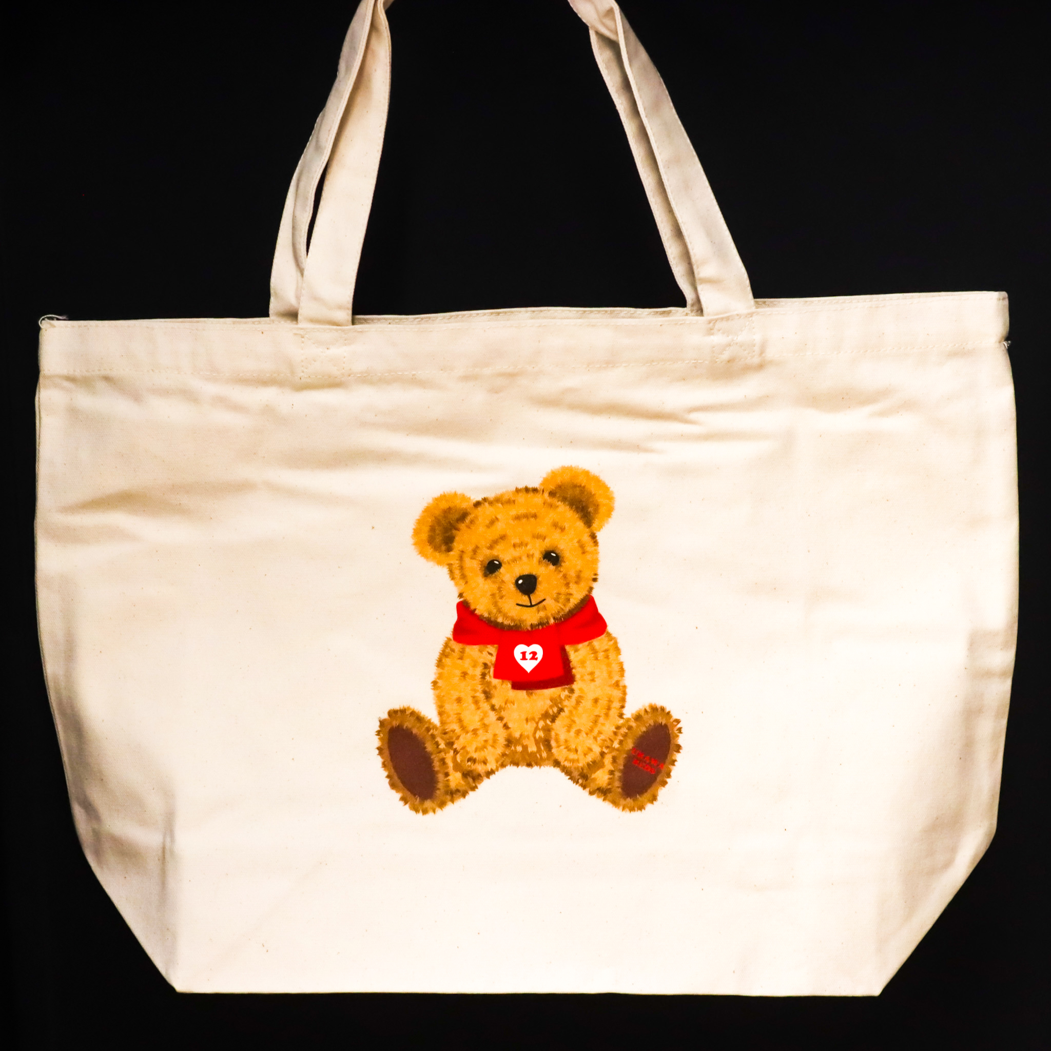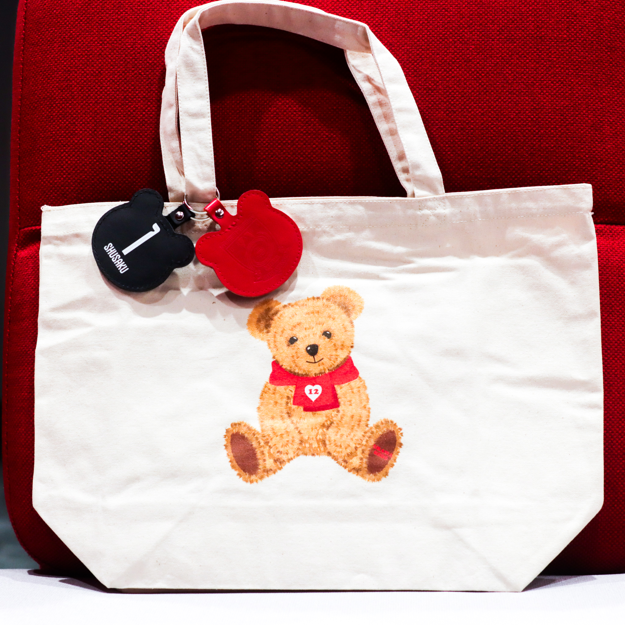 ハート12のタオルマフラーを巻いたベアがデザインされたトートバックに、選手のネーム&ナンバーが入ったベア型のレザーキーリングがセットになったアイテムです。