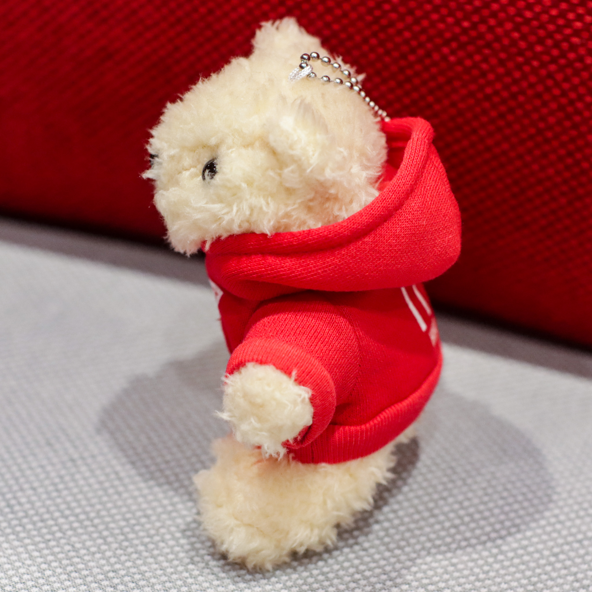 ボックスロゴ風のクールな前面と、選手のネーム&ナンバーをデザインしたパーカーを着ているベアのボールチェーンキーホルダーです。