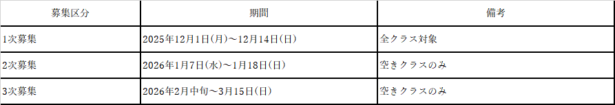 これまで年長児~小学3年生は「前期・後期」の募集制でしたが、2026年度より全学年が通年制(4月~翌年3月)となります。これに伴い募集は年間を通じ今回のみとなり、これまで7月に行っていた後期の募集は行いません。ぜひこの機会にお申し込みください。