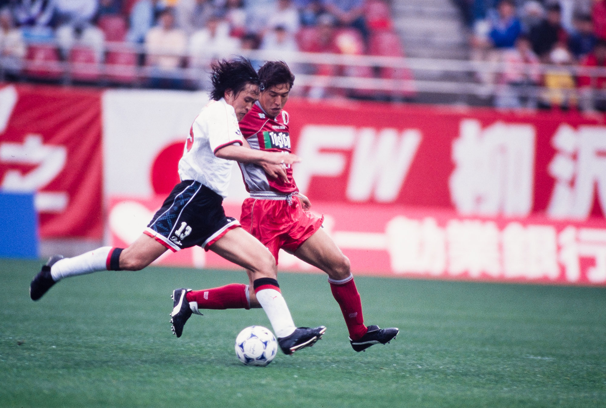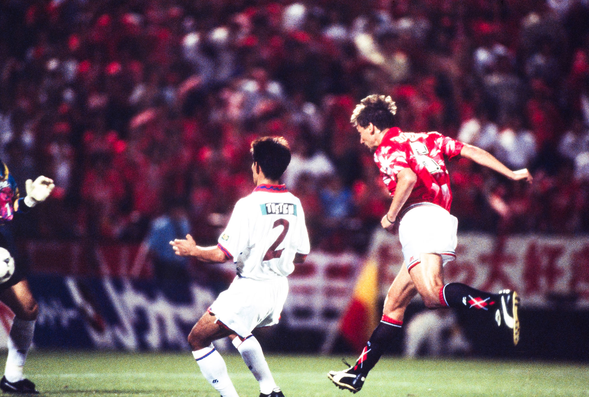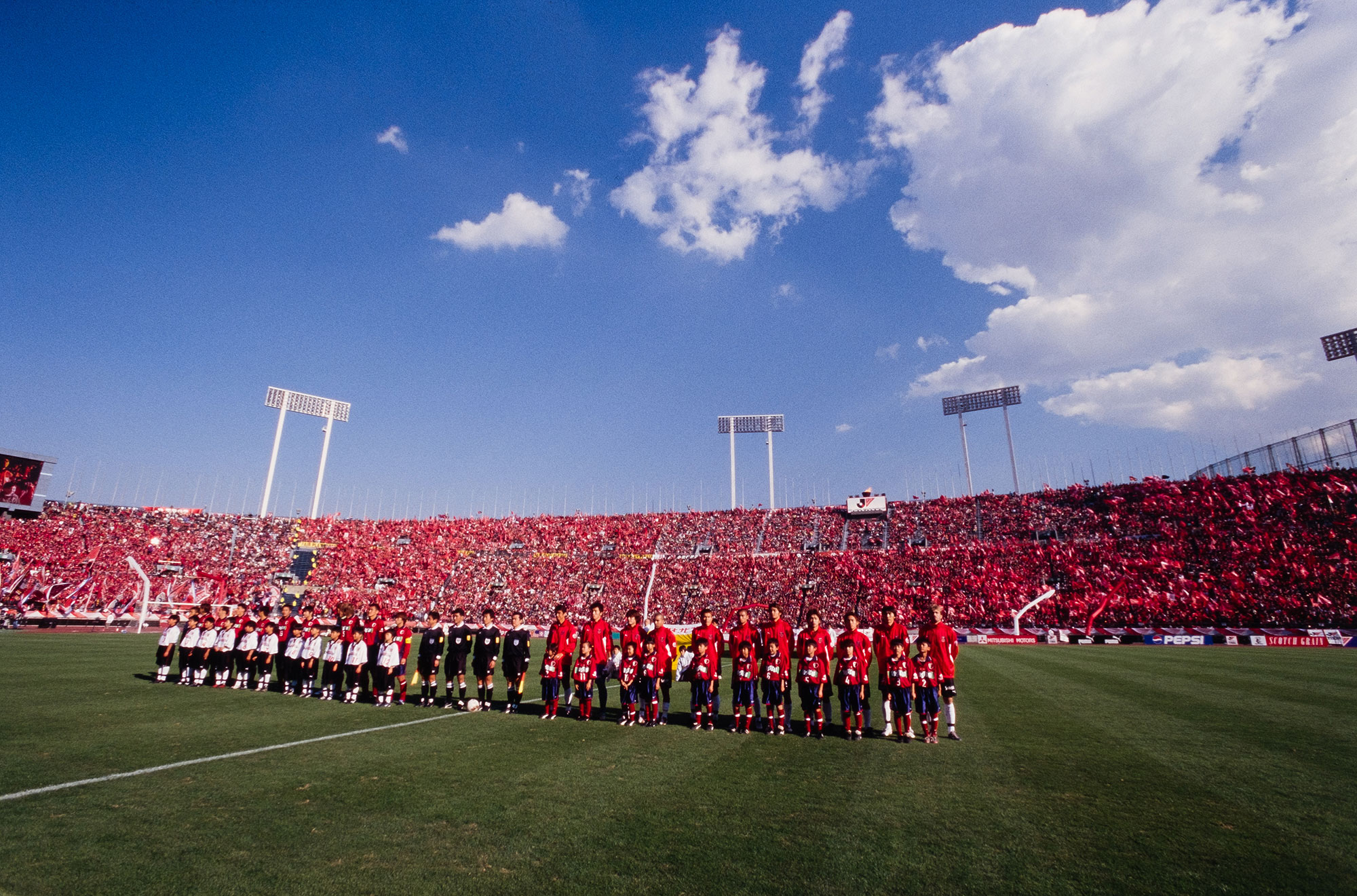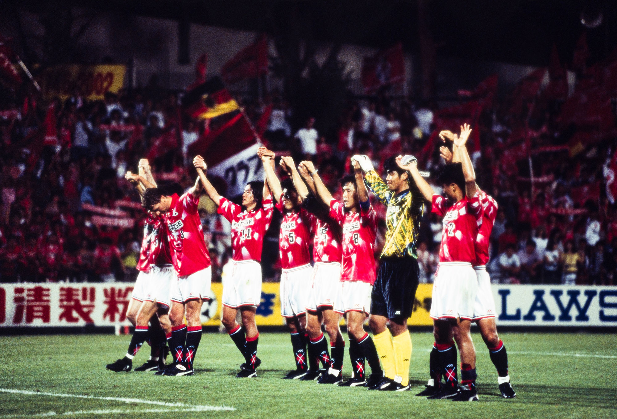 勝てば首位との差を「3」に詰められる、序盤の大一番。レッズサポーターは、このシーズン初めてのビジュアルサポートを敢行。北ゴールを赤く染めた中に、白い「URAWA」の文字を描いた。しかも一文字ずつ黒で縁どりがされており、赤地にくっきりと文字が浮かび上がっていた。選手にアピールする言葉としてはいたってシンプルだが、その完成度は当時のレッズサポーターで、すなわちJリーグで最高だった。