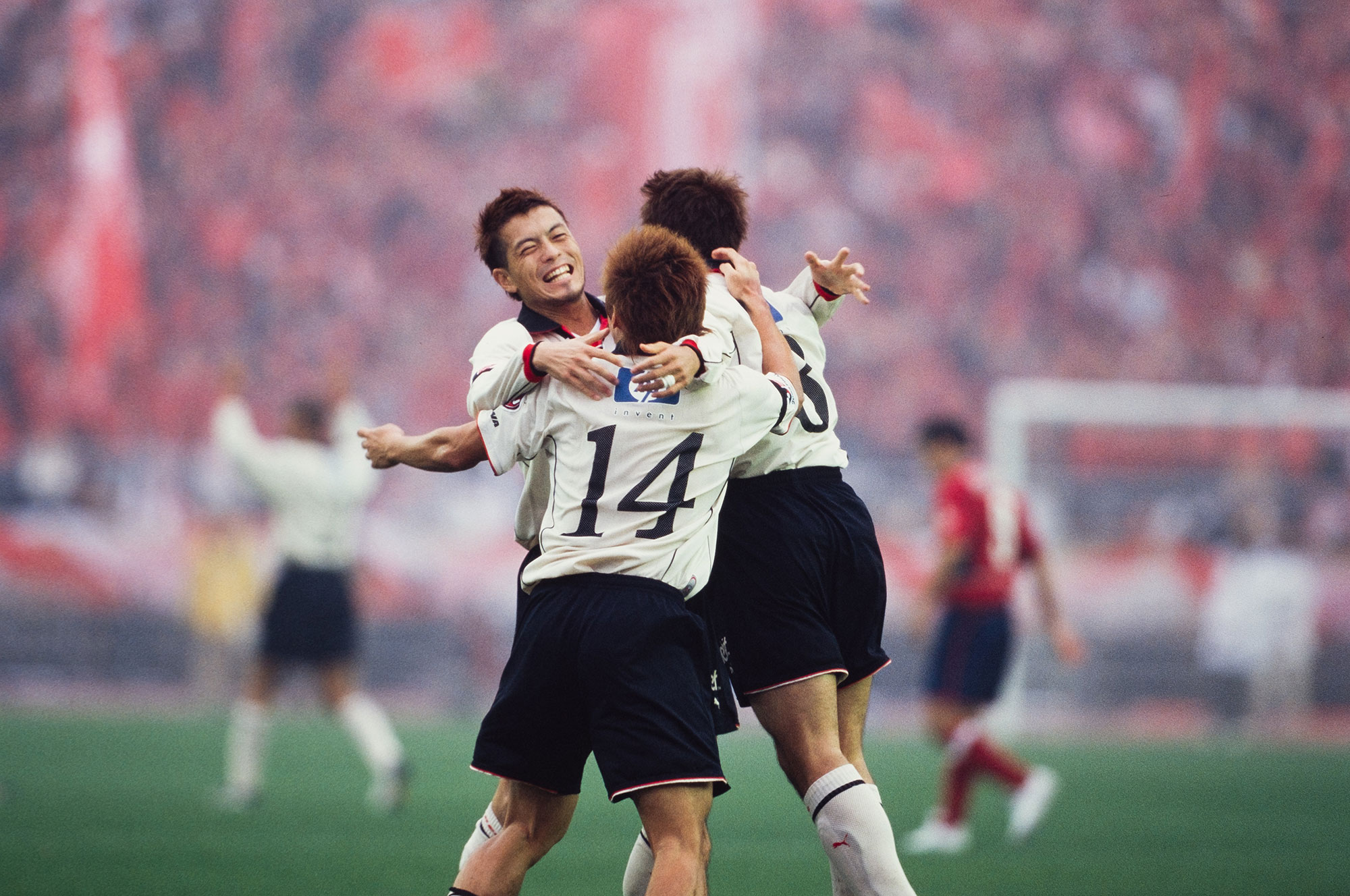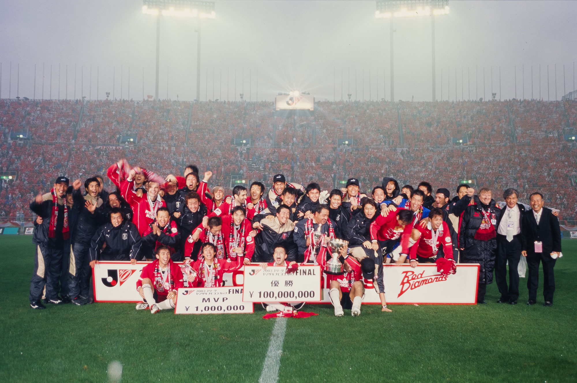 だがその1年後、レッズは振り返らなかった。前半13分に山瀬功治のヘディングで先制。前半36分にエメルソンと坪井慶介が激突して2人とも頭部を裂傷、左目の上を切った坪井はタンカで運び出されたが、オフト監督は交代を送らず、坪井はハーフタイムに国立競技場のロッカールームで縫合手術を受けてピッチに復帰した。後半、レッズはエメルソン、田中達也、エメルソンとたたみかけ、4-0の完勝で「初タイトル」を獲得したのである。