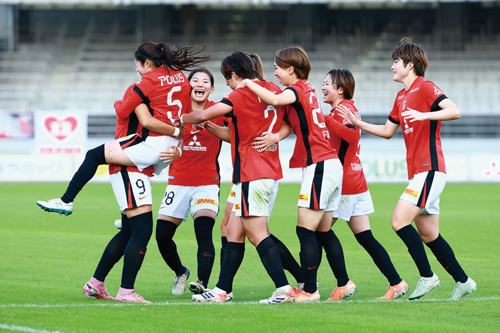 丸い形はサッカーボールを表し、その背景に用いた「赤・白・黒」のトリコロールカラーは浦和レッズを象徴しています。