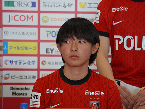 「こんにちは。JFAアカデミー福島から加入しました背番号30、石川璃音です。私は昔からこのチームが大好きでした。憧れていたチームに入り、プレーすることができ、とてもうれしく思います。レッズレディースはとてもレベルが高く、尊敬する先輩方もたくさんいます。先輩方からプレーやオフ・ザ・ピッチなど、すべてのことを学び、成長したいです。2月末には皇后杯決勝、3月にはWEリーグ後半戦が始まります。まずは試合に出場し、少しでもチームに貢献できるようがんばります。また、チームに欠かせない存在になれるよう、精いっぱい努力します。よろしくお願いします」