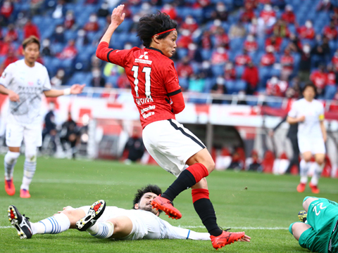 西川周作のJ1リーグ通算500試合出場記念セレモニーが行われた1時間後にキックオフしたこの試合、開始早々にスコアを動かしたのはレッズだった。3分、山中亮輔のクロスから西がゴール左にダイレクトボレーを叩き込んでレッズ加入後初ゴールを奪う。