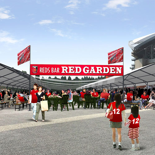 大型テントが南広場に並び、夏の日差しをシャットアウト!!試合前後は心地よい快適な空間の「レッドガーデン」にぜひお立ち寄りください!