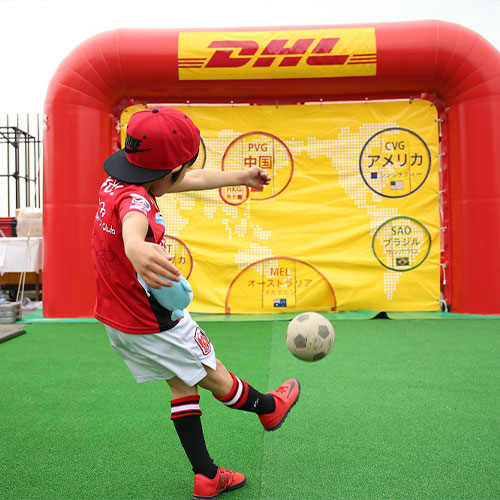世界地図をデザインしたDHLのエアゴールにシュートをきめて、DHLからすてきなプレゼントをもらおう!