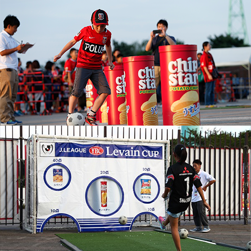 ドリブルゲーム、シュートゲームにチャレンジして、ヤマザキビスケット社の美味しいお菓子をゲット!