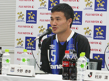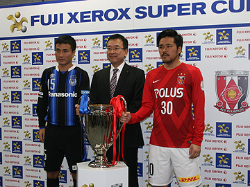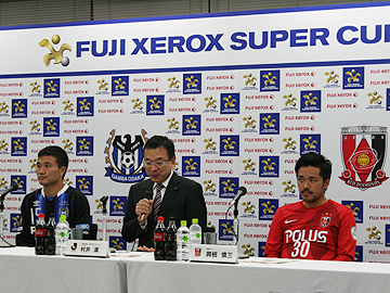 はじめにJリーグの村井 満チェアマンから挨拶が行われた後、2選手による記者会見が行われた。今野選手は「去年は3冠を獲得して最高のシーズンになりましたが、僕はまだガンバ大阪でタイトルを獲り続けたいです。2ステージ制になってますます短期決戦になるので、この『FUJI XEROX SUPER CUP』で浦和を倒して、勢いをつけて開幕から全力で突っ走りたいと思います」と決意を語った。