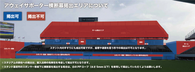 ・横断幕のスタンド内の鉄柵への取り付けは可能ですが、階段をまたぐ掲出や、座席に被るような掲出はできません。