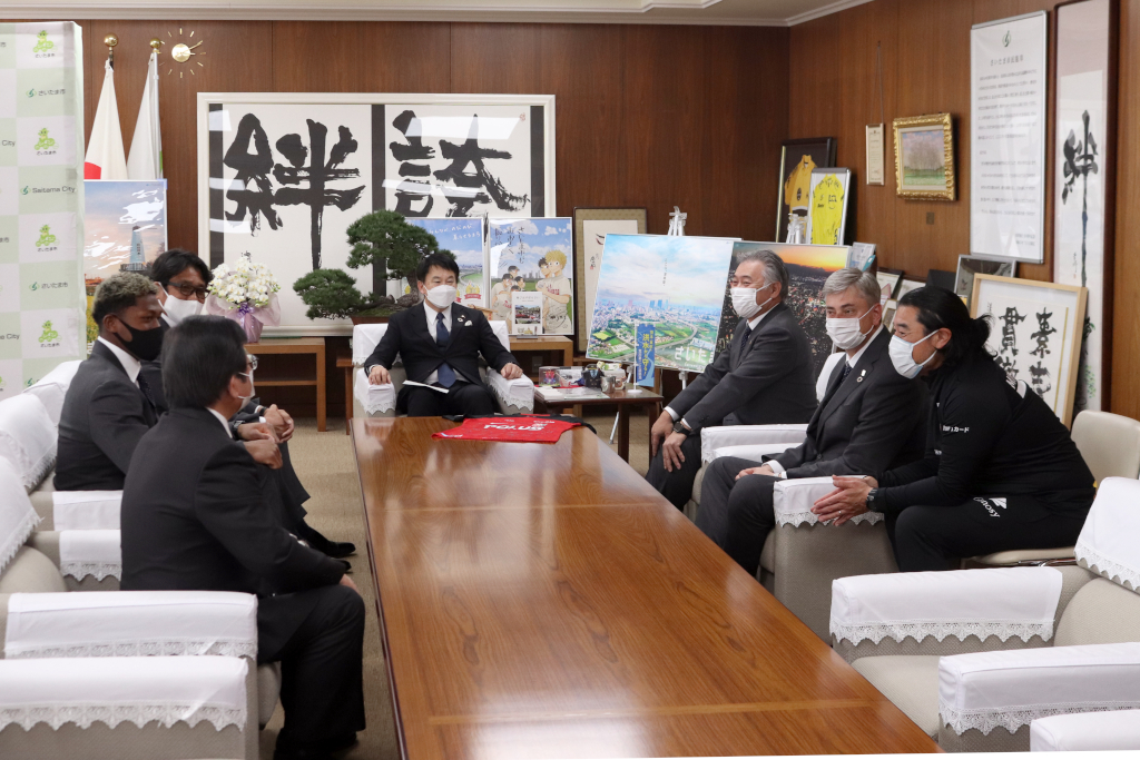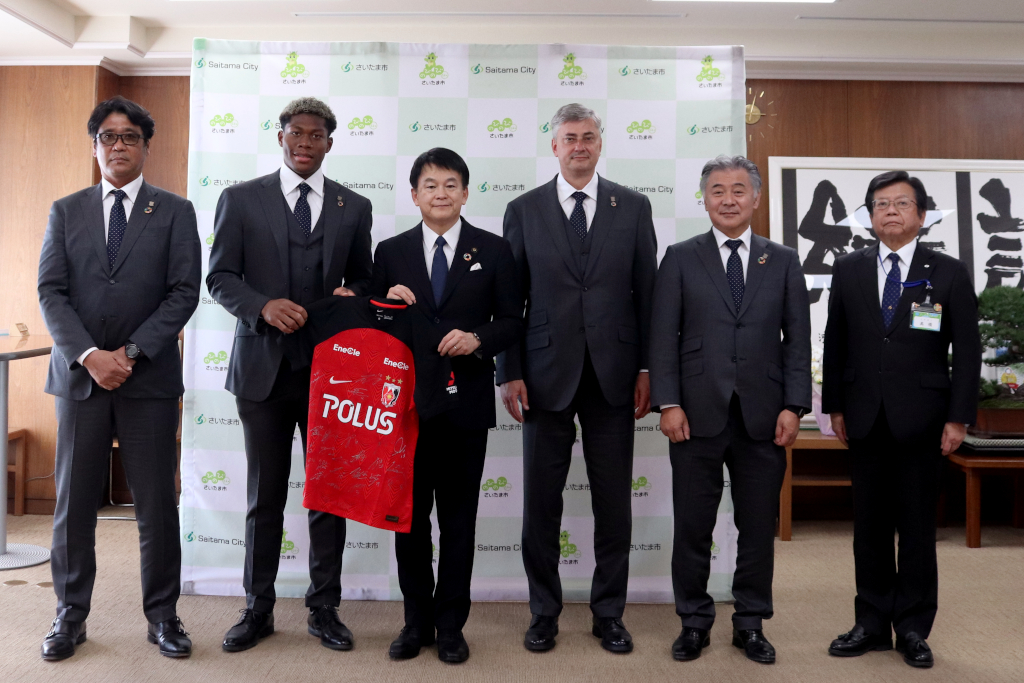 15日、マチェイ スコルジャ監督、鈴木彩艶、土田尚史スポーツダイレクター、白戸秀和ホームタウン本部 本部長がさいたま市役所を表敬訪問した。