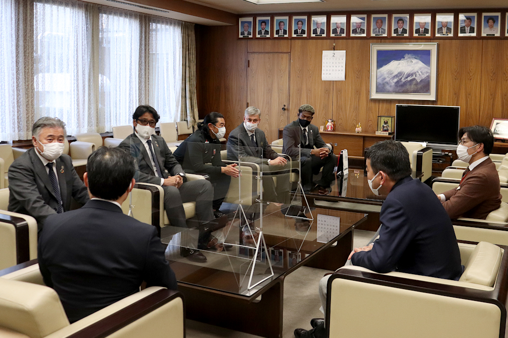初めに、清水勇人市長を表敬訪問。選手のサインが入ったユニフォームを清水市長にプレゼントし、記念撮影をした後に歓談した。