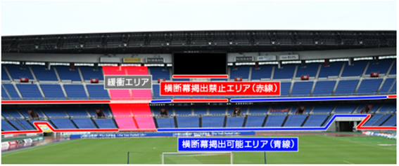 ・1Fと2Fを跨いでの幕の掲出は禁止となります。(選手入場時のみ一時的な掲出は可。キックオフ前には撤収)