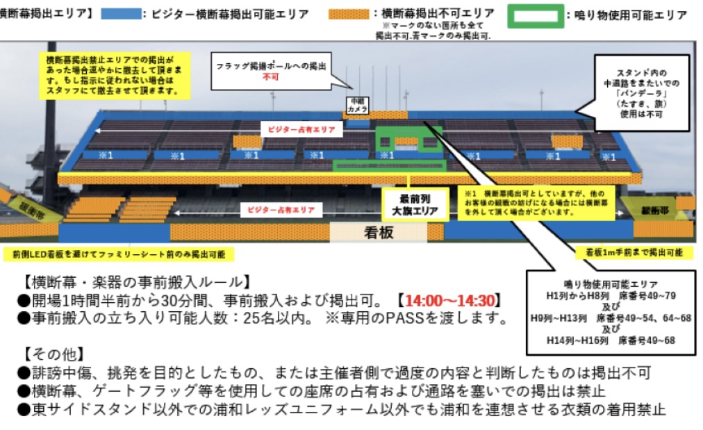 ※1『西サイドゲート』からの入場、ならびに『西サイドスタンド』での観戦は完全に不可。ビジターチームの応援グッズ並びにビジターチームを連想させる衣類(埼玉や浦和の記載等)を身に着けた方は『東サイドスタンド』以外の全ての席種で観戦することを禁止とします。