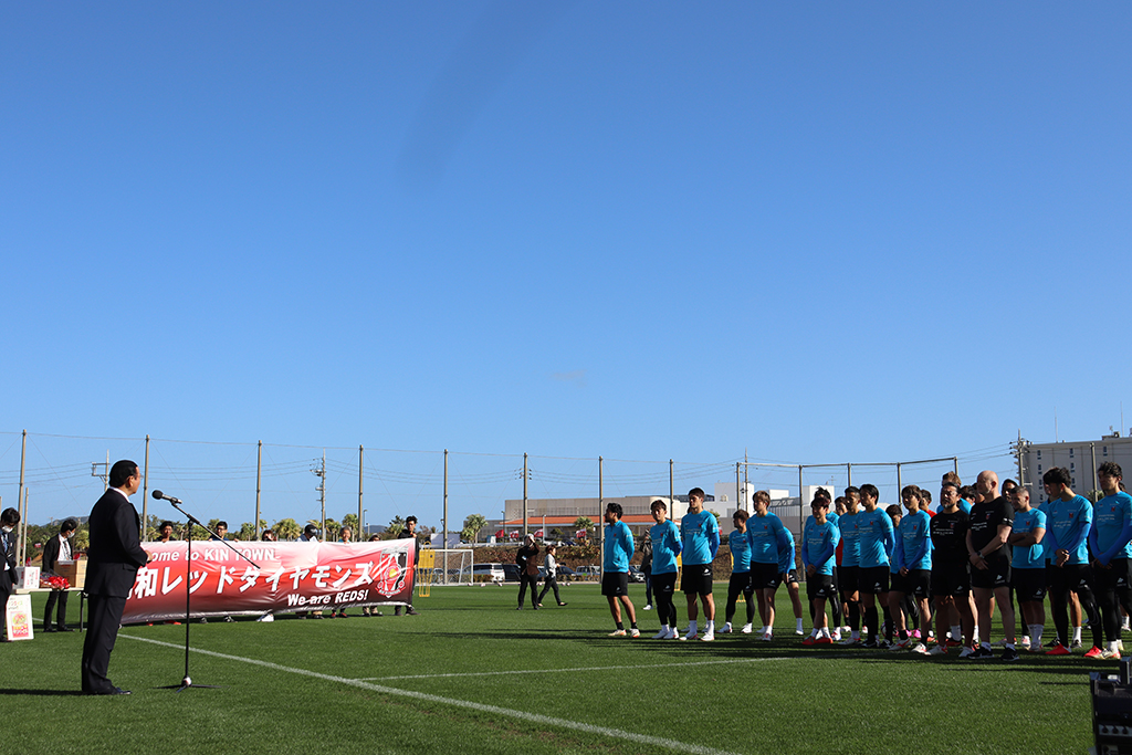18日、沖縄トレーニングキャンプが実施されている沖縄県国頭郡金武町の金武町フットボールセンターにて、仲間 一町長をはじめとした金武町のみなさまによる歓迎セレモニーが行われた。