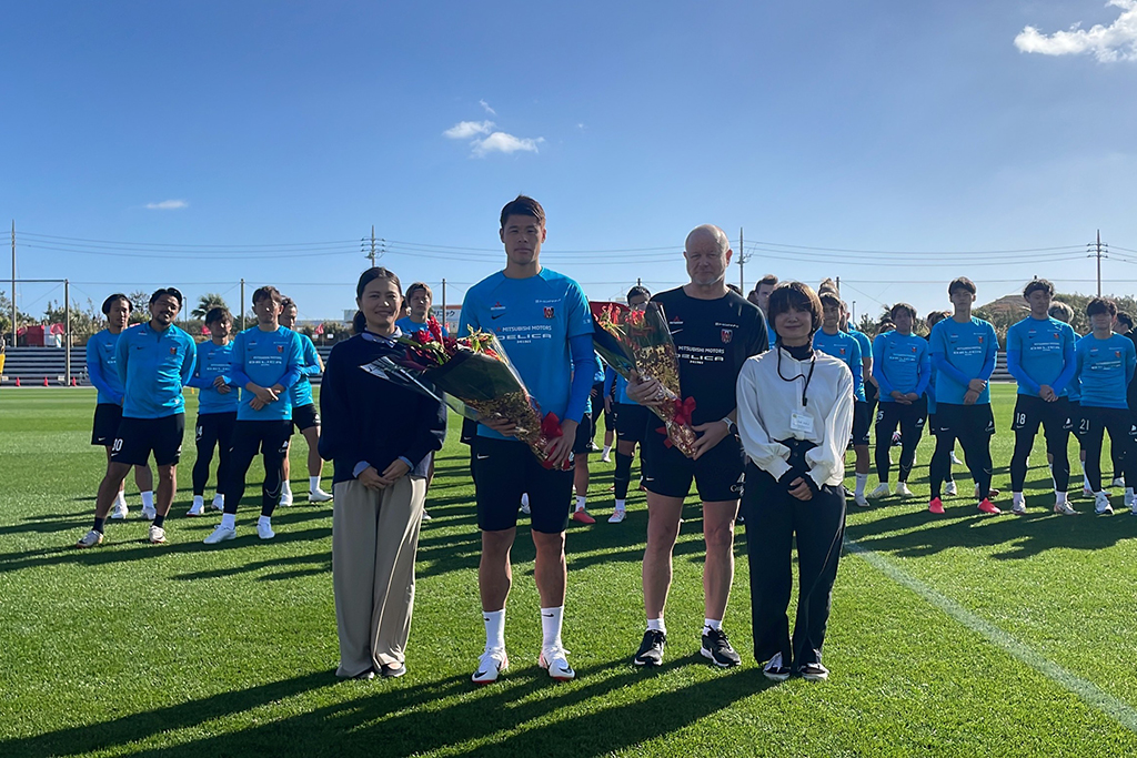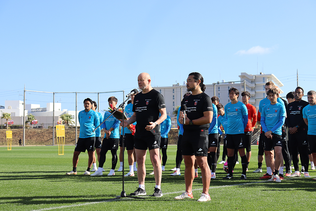 仲間町長から歓迎のあいさつをいただいた後、ペア マティアス ヘグモ監督と酒井宏樹に、花束が手渡された。続いて、キャンプ地の金武町から「龍」「松藤」、沖縄県より「金武町産田芋アイス」「金武のタコライスレトルトパック」が陣中見舞いとしてチームに贈られ、岩尾 憲、関根貴大、アレクサンダー ショルツ、興梠慎三が受け取りました。