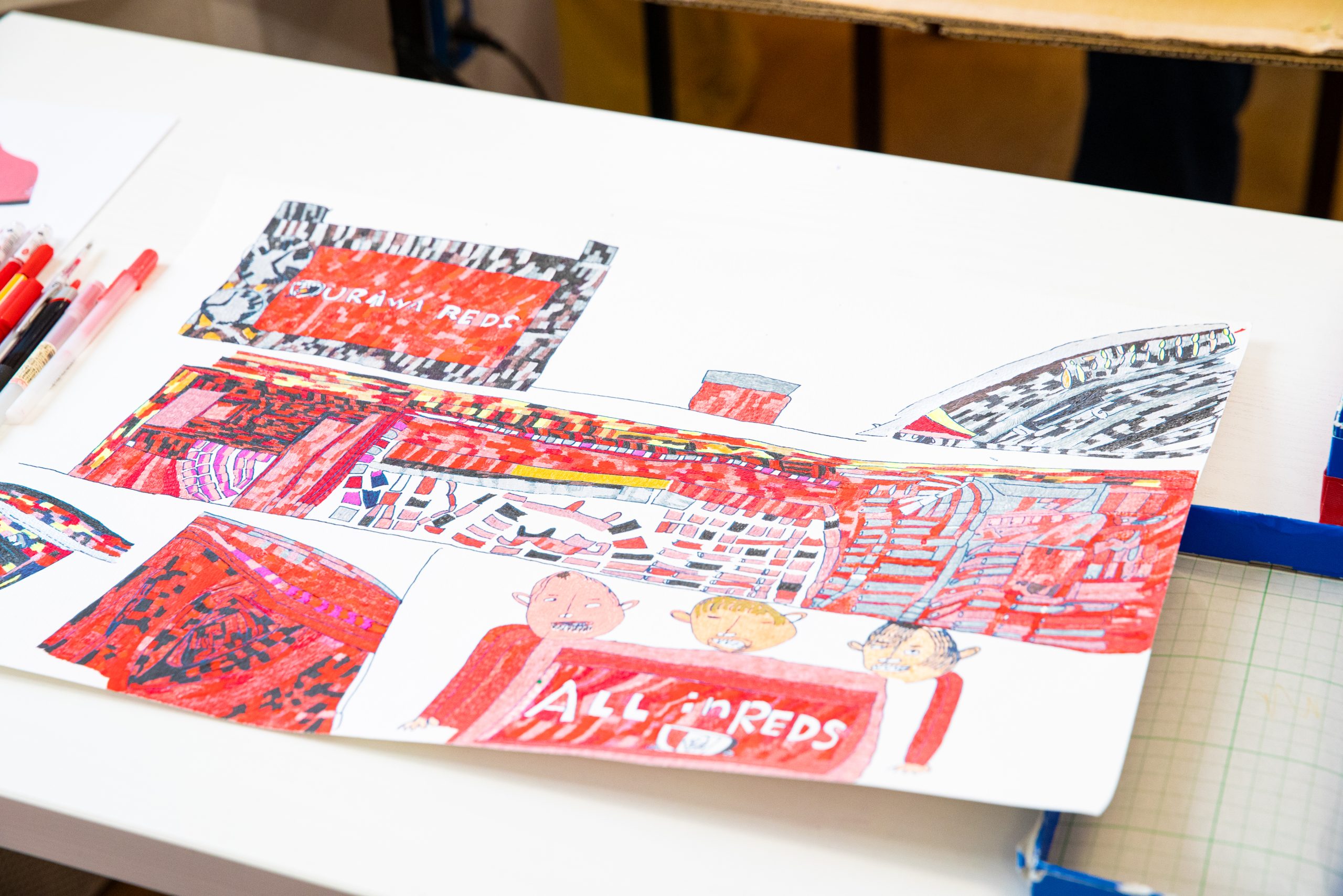 2023シーズンからスタートし、多くのファン・サポーターの方々にご好評いただいている、障がい者アート展「LIVE TOGETHER!」も、その活動のひとつである。埼玉スタジアムのホームゲームの会場で開催されている本展では、障がいのあるアーティストたちの作品を通じて、多様な表現に触れられる機会になっている。さらに、今回の訪問では、2026年2月初旬に開幕する明治安田Jリーグ百年構想リーグの大会期間から展示される作品も見せてもらうなど、訪問ならではの貴重な体験となった。