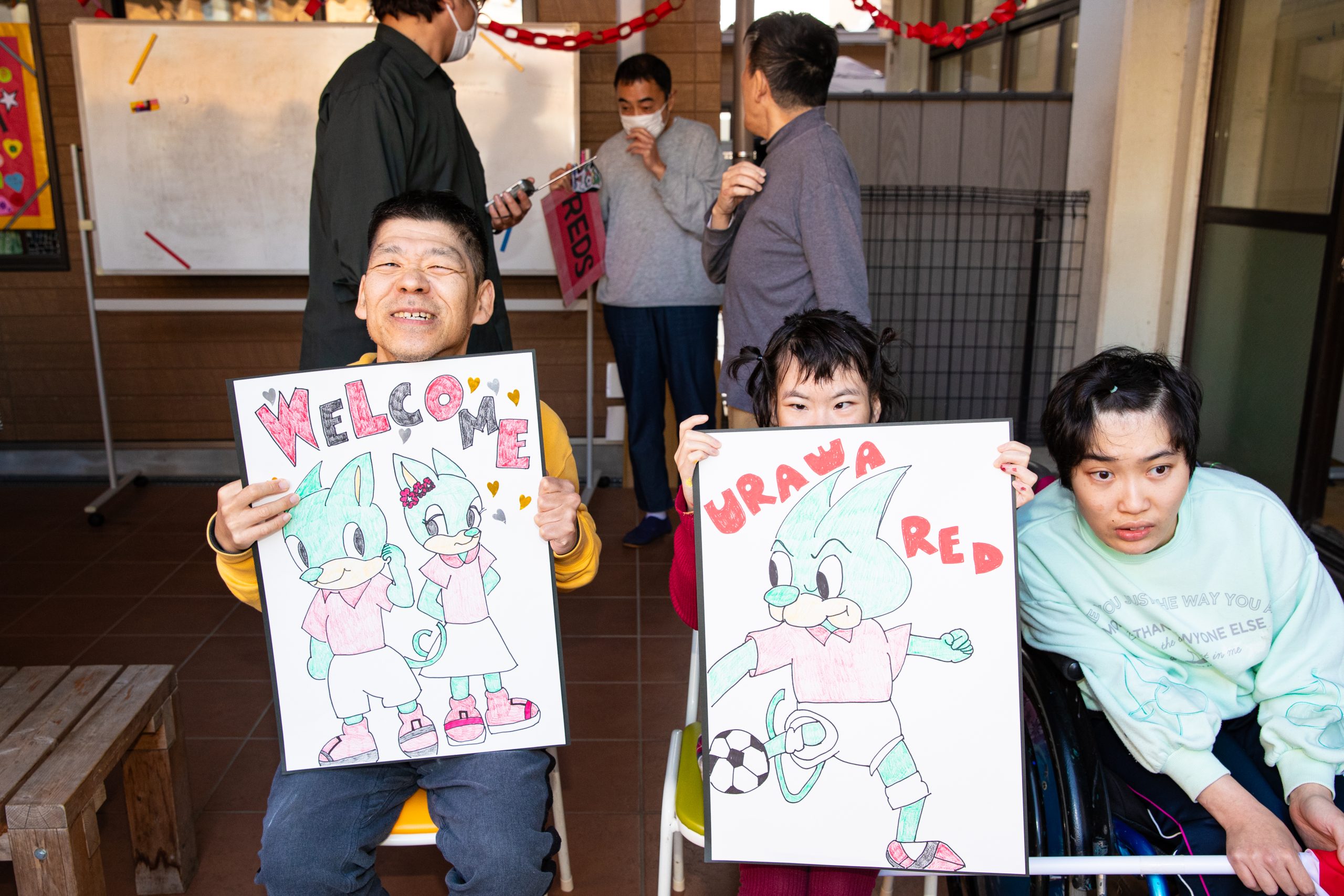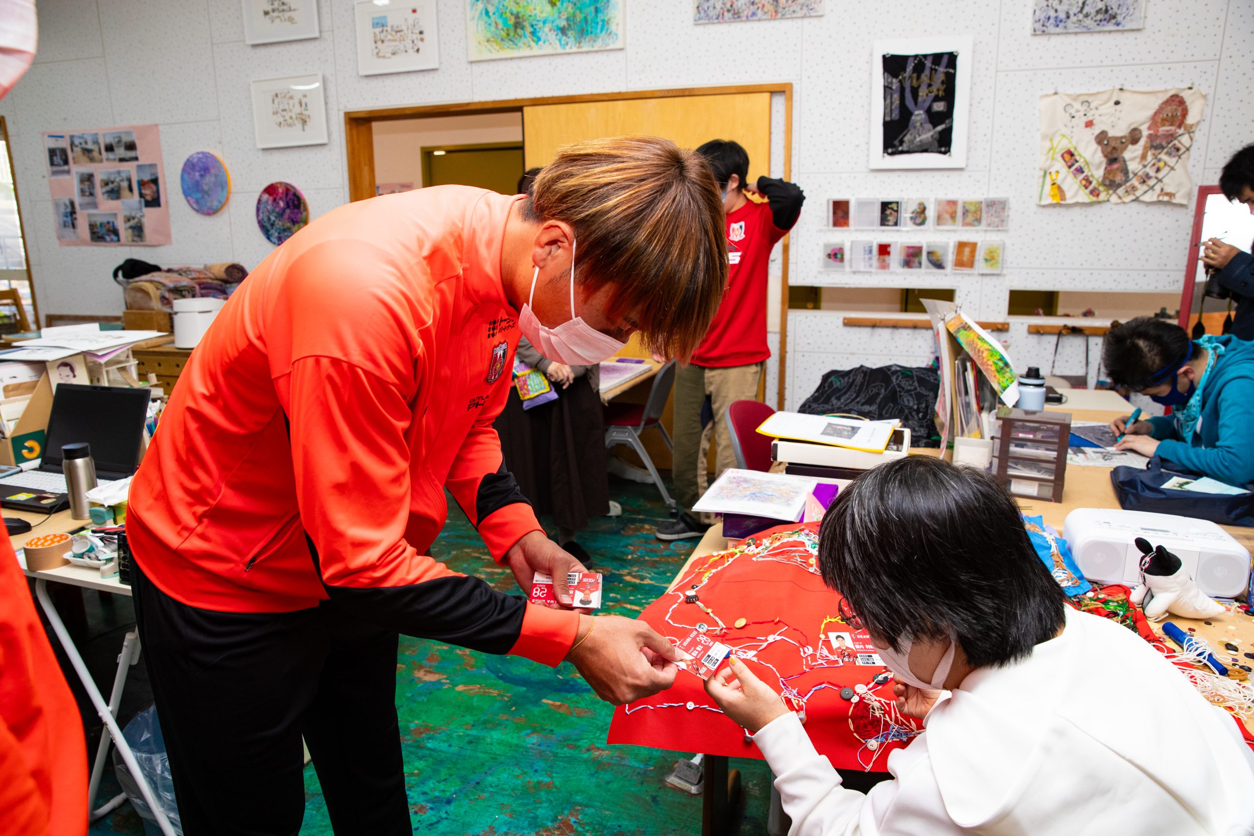 当日は、「工房集」、「川口太陽の家」を訪問し、たくさんのアーティストのみなさんと交流。笑顔で出迎えてもらった二人は、和やかな時間を過ごした。選手二人の似顔絵が描かれた装飾に笑顔を見せ、アーティストのみなさんと名刺交換をしたり、会話を楽しみながら親睦を深めた。