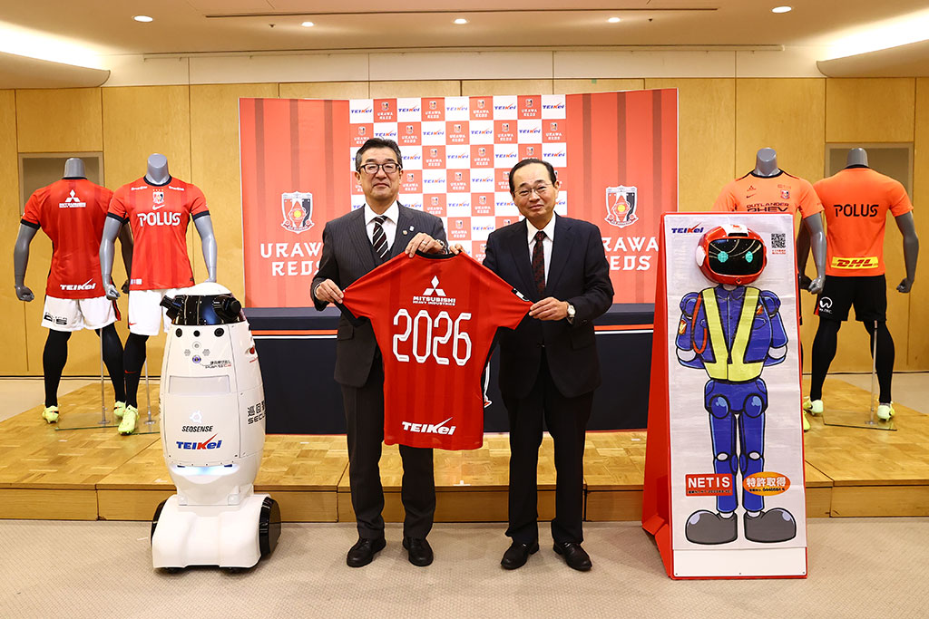また、田口から、「今回の提携を機に、埼玉スタジアムで開催されますホームゲームでは、警備ロボットを使った警備など、新たな取り組みを共同で実施」することも説明された。大阪・関西万博でも活躍した自律移動型警備ロボット『SQ-2』や、『折警』と呼ばれる折り畳み警備員が新シーズンから埼玉スタジアムのホームゲームに導入される。