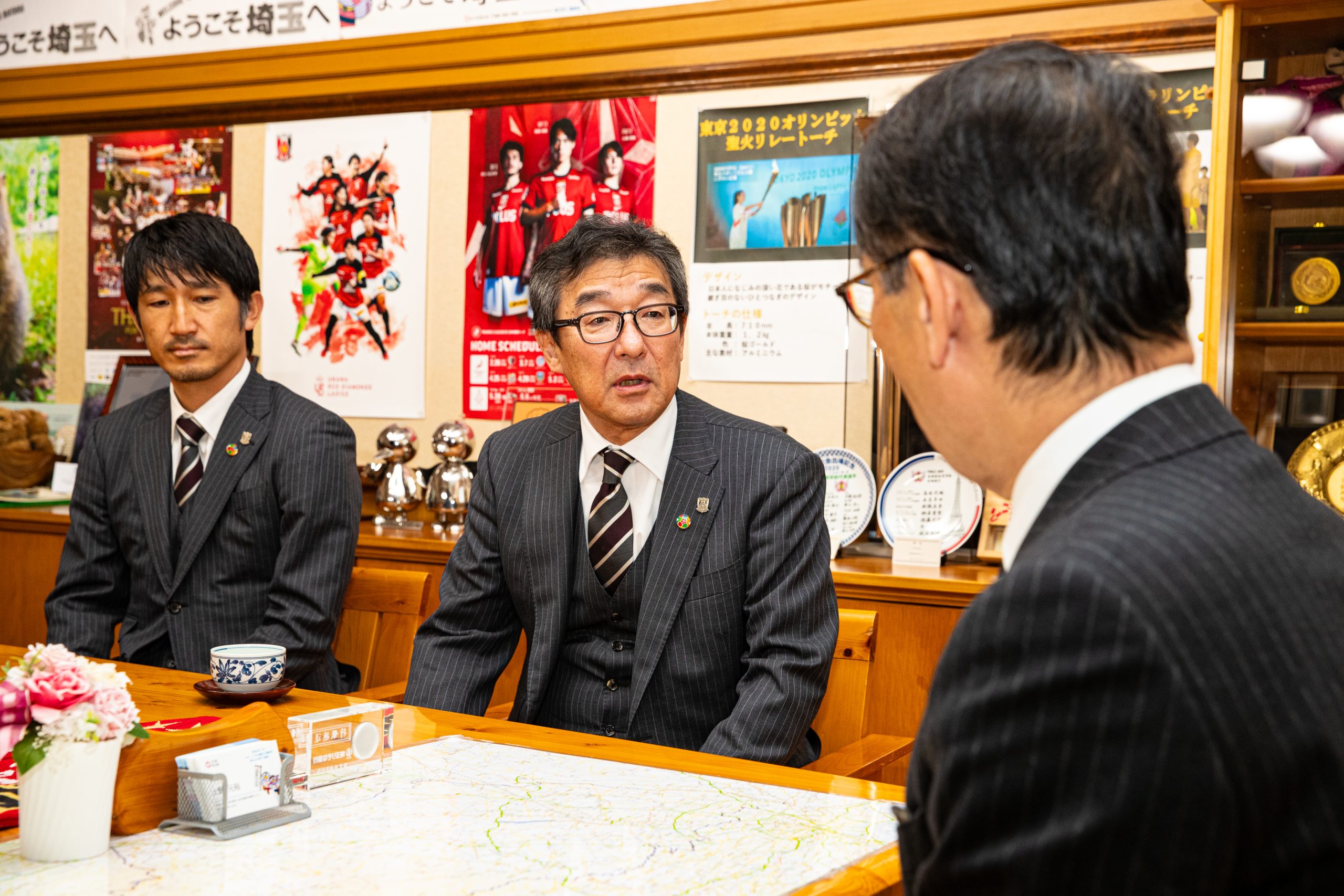 埼玉県庁では、田口より「明治安田J1百年構想リーグは、シーズン移行前に行われる非常に重要なリーグであり、優勝するとACLの出場権を獲得できる重要な大会。県民のみなさまの応援が我々の一番の力となるため、引き続きご声援をお願いしたい」とあいさつした。