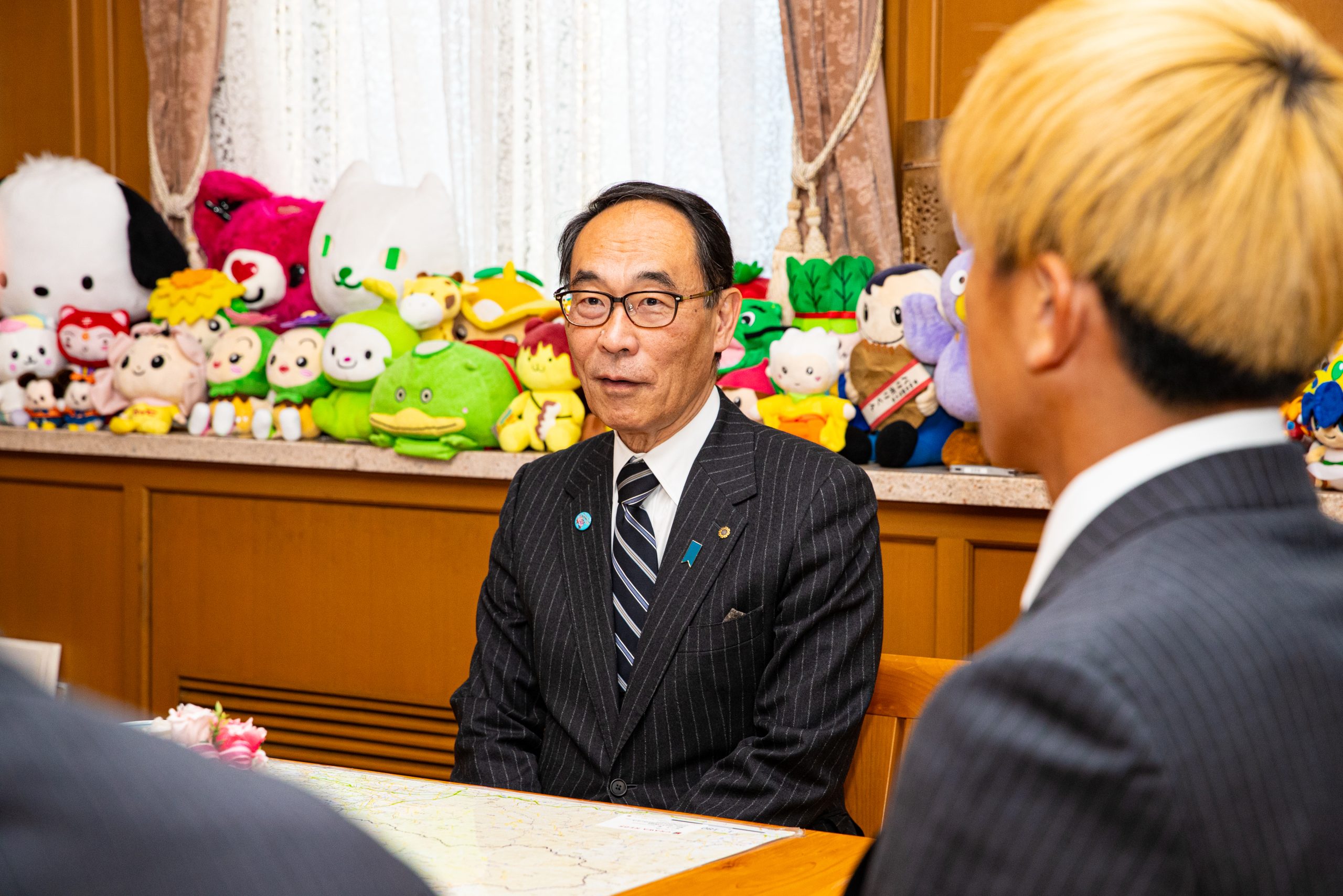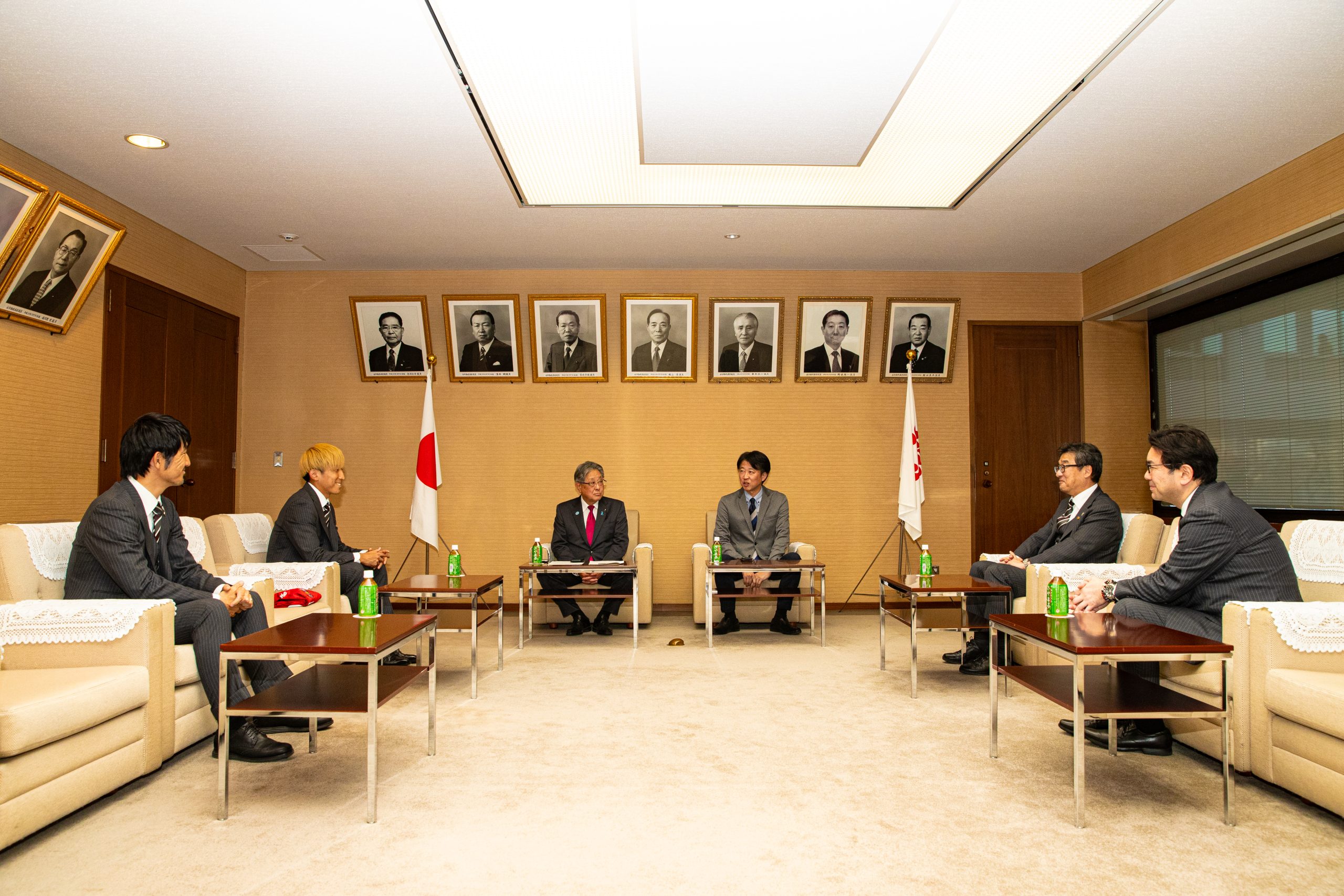 その後の歓談では、シーズン移行期の気候に話題がおよぶ場面もあり、金子からは「暑い時期に試合をするよりも、寒い時期の方が自分には合っていると感じる」と話し、続けて「コンディションも保ちやすく、怪我も少ない方なので、シーズンを通して良いパフォーマンスを発揮していきたい」と意気込みを語った。その後も終始穏やかな雰囲気の中で歓談が進み、最後に金子から記念品を贈呈し、全員で記念撮影を行なって表敬訪問は終了した。