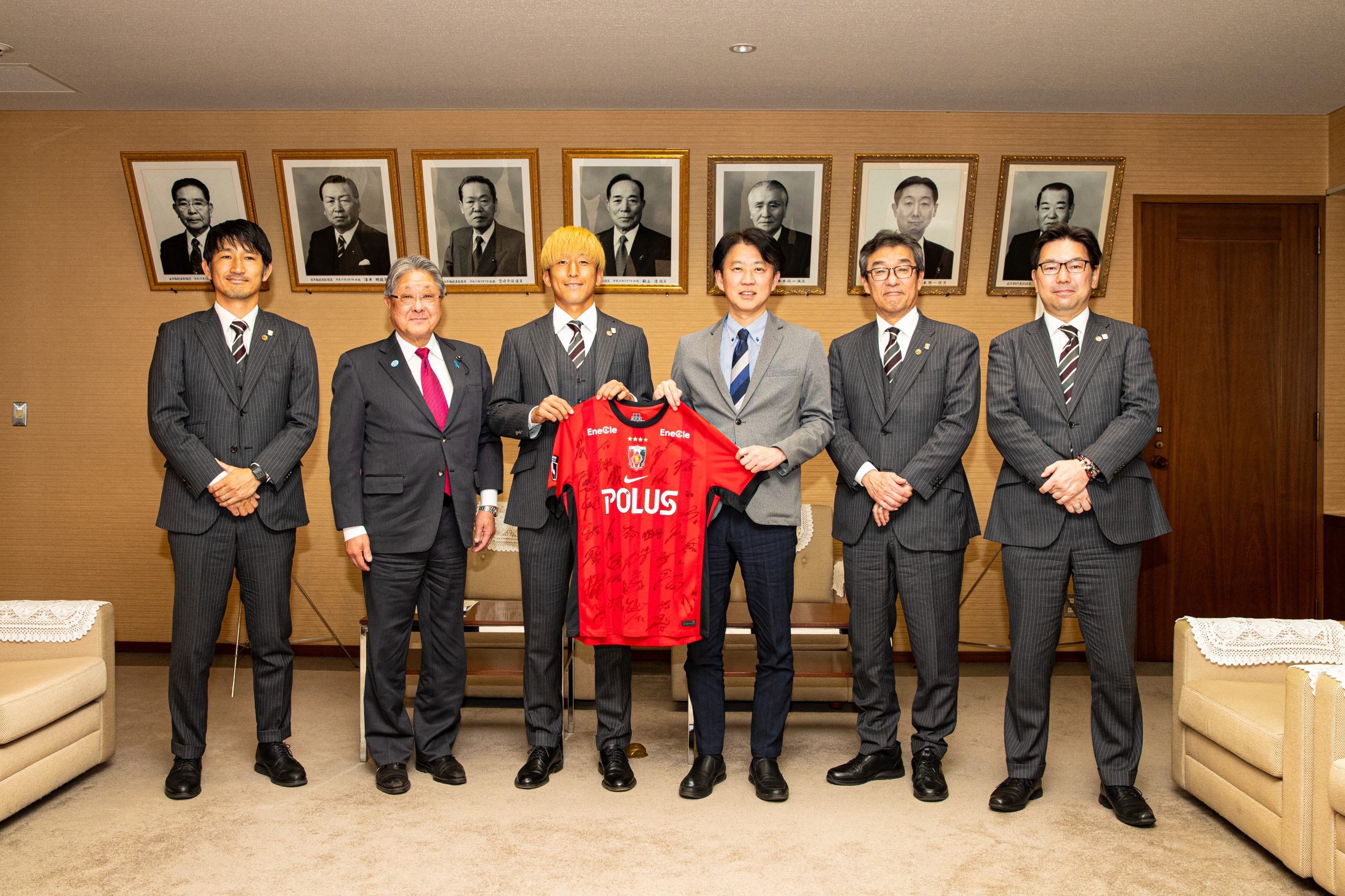 その後、大野知事に浦和レッズのユニフォームを贈呈し、大野知事から埼玉県のマスコット「コバトン」のぬいぐるみが贈られ、最後に全員で記念撮影を実施し、埼玉県庁の表敬訪問は終了した。
