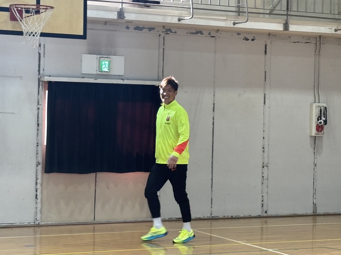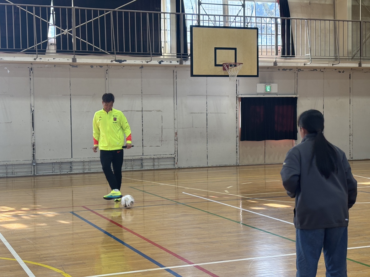 その後、児童たちとボールを使ったパスラリーやじゃんけん大会を実施。さらに、じゃんけん大会の後には当日の2回目のサプライズとして、この日誕生日を迎えた児童に色紙にサインを書いてプレゼント。そして全員でバースデーソングを歌うなど、児童たちと触れ合う時間を過ごした。