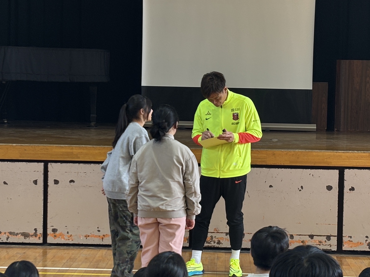 「これからみなさんは中学生になって、やりたいことや、もしかしたらやりたくないことが自分の中で決まってくると思います。もし苦手なことや、つらいと思うことがあったら浦和レッズの試合を観て、少しでも気晴らしにしてくれたらうれしいです。自分もピッチでがんばってプレーするので、ぜひスタジアムに来て応援してください!」